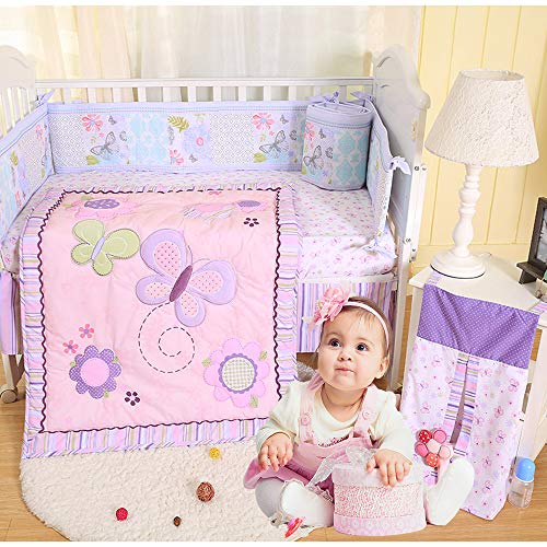 Brandream - Juego de cama para cuna con mariposa, color morado, para niñas, ropa de cama floral para guardería, rosa y morado, 9 piezas Brandream - Juego de cama para cuna con mariposa, color morado, para niñas, ropa de cama floral para guardería, rosa y morado, 9 piezas