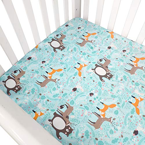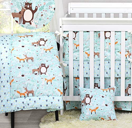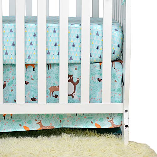 Brandream Woodland - Juego de cama para guardería, juego de cuna para niño, ciervo, oso, zorro, ropa de cama para bebé, 3 piezas, edredón de animales, sábana ajustable, falda de cuna, 100% algodón
