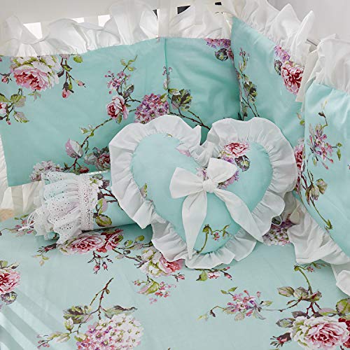 - Unique DesignThis gorgeous French Country floral crib bedding set is perfect for your baby girl nursery. Elegant roses and lilac hydrangeas bestrew on the blue green background, brings a peaceful country style. Charming but elegant, great match with any home decorationOpen dynamic new journey to sleep. smooth refreshing give your little princess health and good sleep.