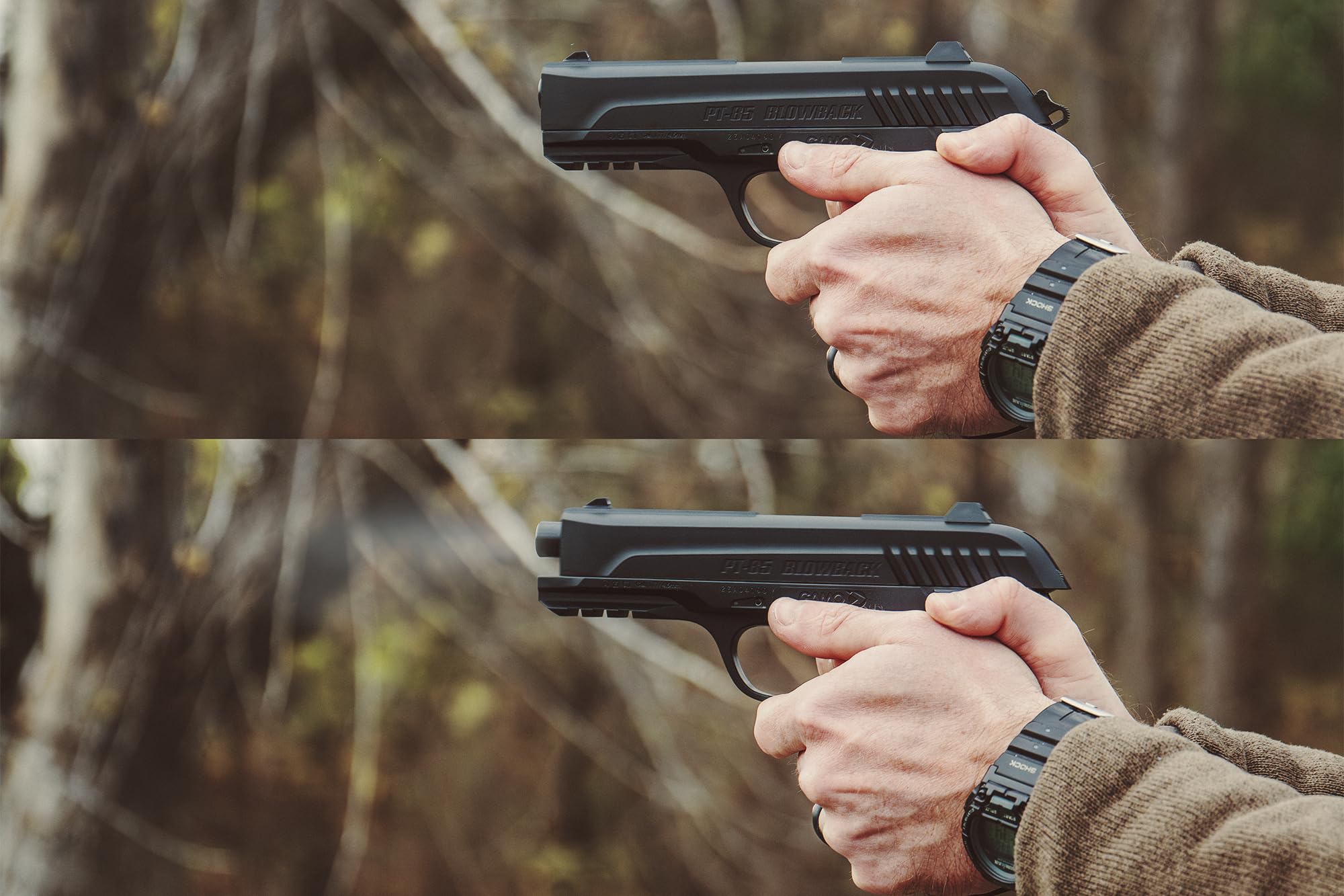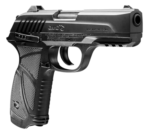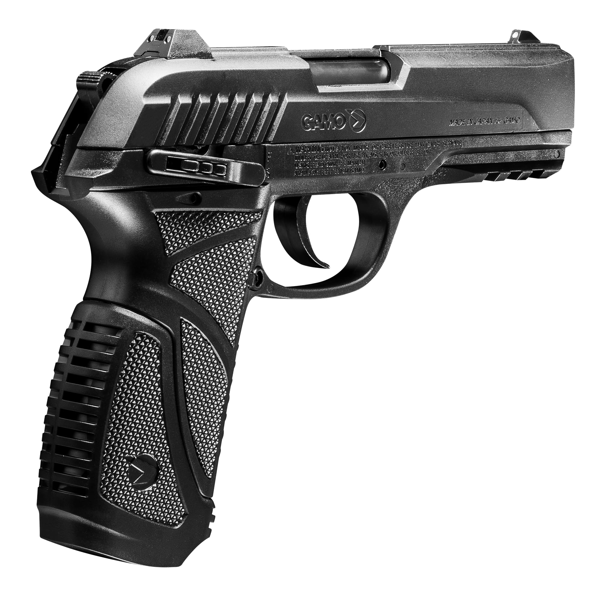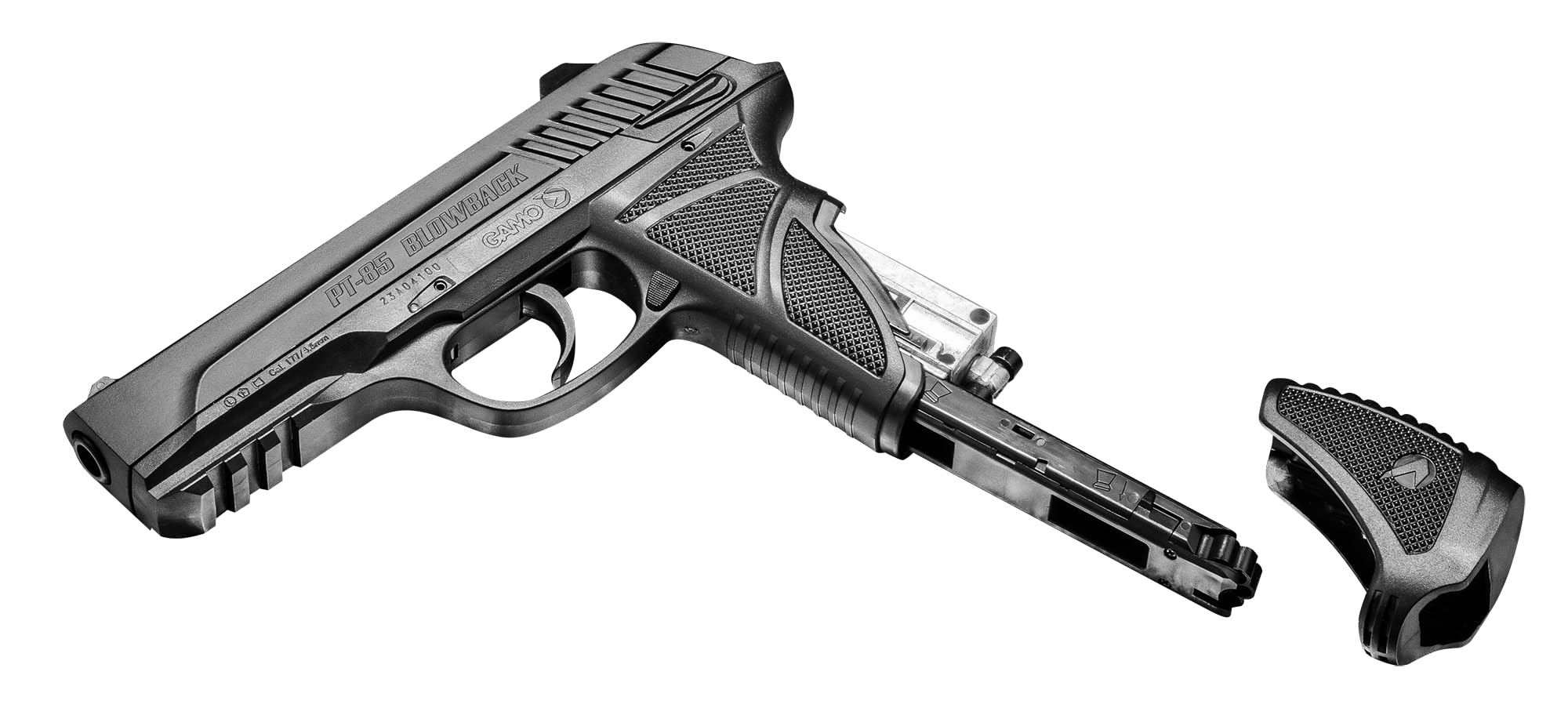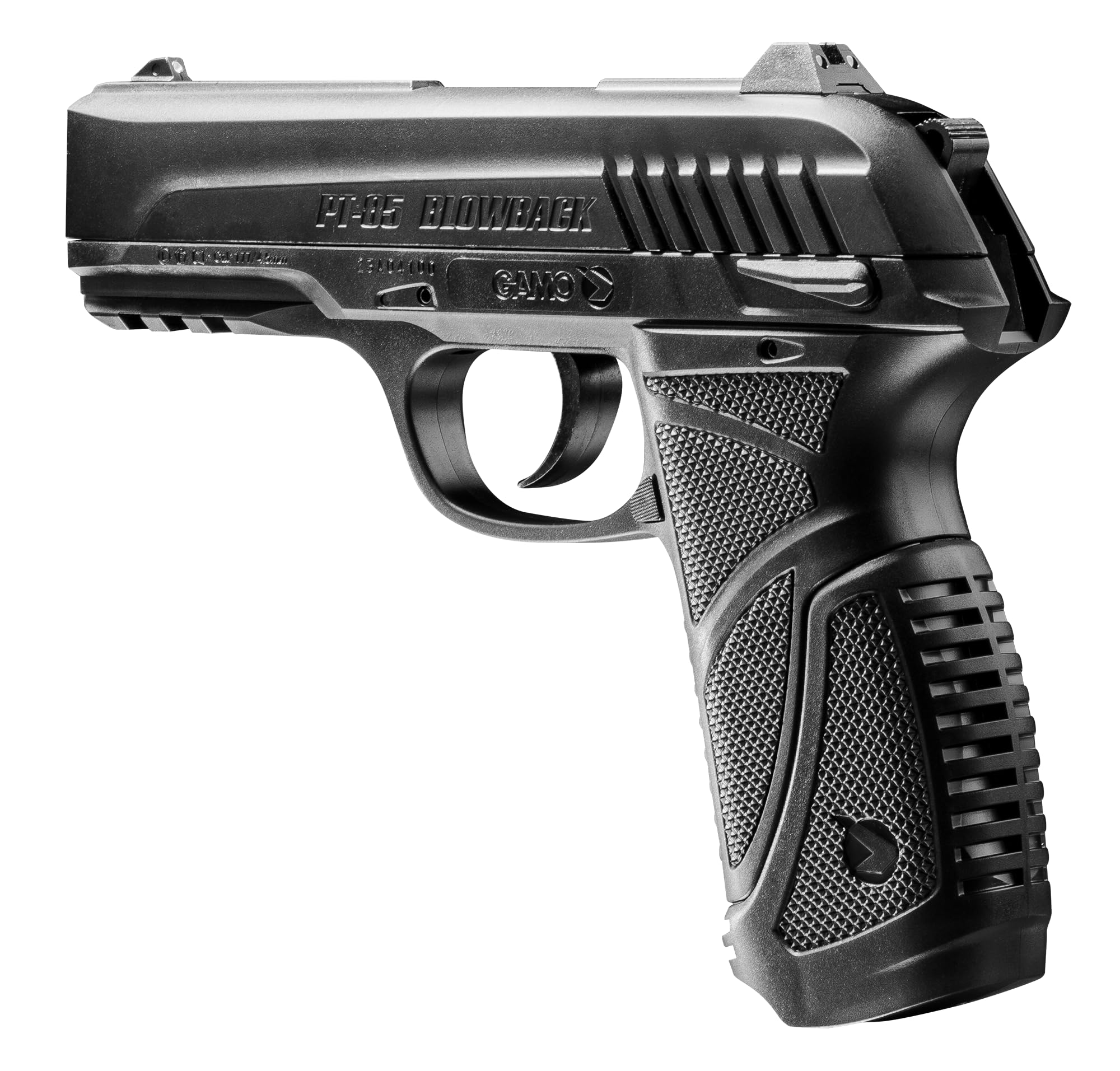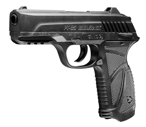 Amazon.com Equipped with an innovative Blowback feature, the PT-85 CO2-powered air pistol delivers a realistic action and an authentic look and feel when shooting. The Blowback pistol accomplishes this by using a small portion of air to move the slide backward when firing. As a result, you'll feel like you're shooting the real thing. The PT-85 also includes a rifled steel barrel, a textured grip, and a 16-pellet double magazine. The pistol is capable of shooting at velocities of up to 450 feet per second with Gamo PBA platinum pellets. Only standard-skirt pellets should be used with PT-85 Blowback pistols. To avoid damaging the magazine, never use long-skirt pellets, such as Red Fire, Blue Flame, Glow Fire, PBA Bullet, or TS-10. Specifications Sights: Fixed with reflective white dots Velocity: Up to 450 fps Caliber: 0.177 Ammunition: 0.177-caliber pellets Length: 7.8 inches Weight: 1.5 pounds Warning: Airguns are not toys. Airguns are recommended for use by those 16 years of age or older. Adult supervision required. Misuse or careless use may cause serious injury. Do not brandish or display your airgun in public. It may confuse people and it may be a crime. Police and others may think an airgun is a firearm. Do not change the coloration or markings to make it look more like a firearm. Buyer and user should conform to all laws governing the use and ownership of their airgun. The person handling the airgun and anyone nearby should always wear protective eyewear. Read all instructions before using. Always use care and shoot safely. Product Description The PT-85 Blowback CO2 powered air pistol features a rifled steel barrel and textured grip, and produces 450 feet per second velocities with PBA Platinum Pellets. This pistol comes with a pellet clip that holds 16 rounds (2 8-pellet double rotary clip). The PT-85 has a tactical rail underneath the barrel that enables mounting accessories like lasers or lights. It also features semi-auto action and fixed sights with reflective white dots. Caution: Only standard-skirt pellets should be used with the P-25 Blowback pistols. To avoid damaging your magazine, never use long-skirt pellets, such as: Red Fire, Blue Flame, Glow Fire, PBA Bullet, Magnum, Master Point, Armor, Lethal, Rocket or TS-10.