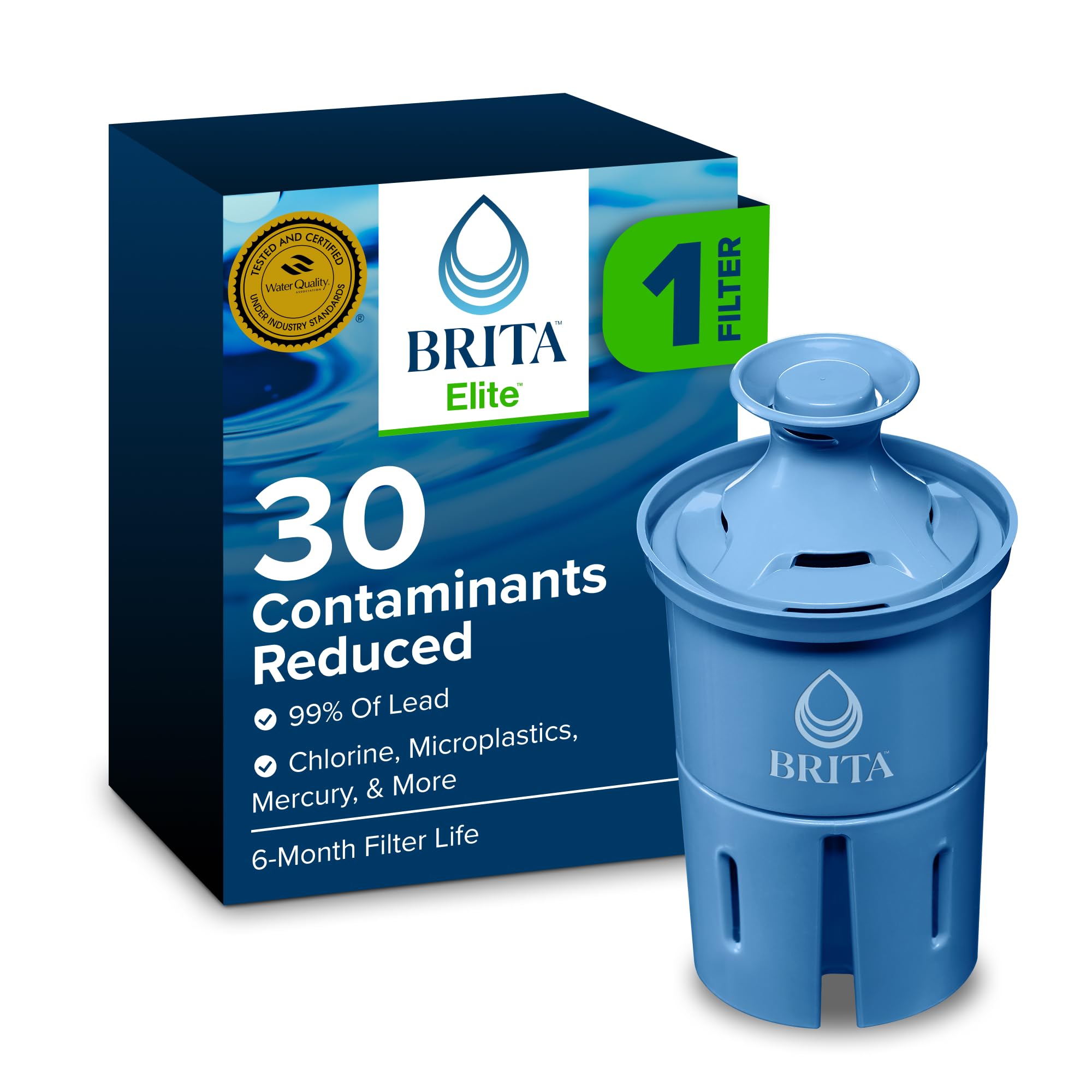 Get cleaner*, great-tasting water for longer with the Brita Elite Pitcher Replacement Filters which remove 99% of Lead* in your water and reduces 30 contaminants. This long-lasting water filter is made with Advanced Carbon Core Technology to reduce more than 3x the contaminants of standard Brita filters. The Brita Elite replacement filter reduces Lead, Asbestos, Mercury, Benzene, Cadmium, and more*. Change the Brita Elite filter every 120 gallons, about every 6 months for best performance**. The pull top cap makes insertion and removal easy. With activated carbon to reduce chlorine taste and odor, this water filter delivers great-tasting water and maintains a healthy level of fluoride (applies to fluoridated municipal tap water). The fibrous matrix in the filter holds active ingredients in place so no black flecks appear in your water. One Brita Elite filter can replace up to 900 16.9 oz single-use plastic bottles and reduces more contaminants vs. PUR and ZeroWater (based on NSF/WQA certifications for Brita OB06, PUR PPF951K, and ZeroWater ZF-201 pitcher filters as of 8/17/21). *Cleaner vs. tap water. Healthier based on health contaminant reduction per WQA certifications. Substances reduced may not be in all users water. See certifications. **Approximate timing based on 120 gallon (454 litres) lter life and average family usage of 11 glasses per day. ^Versus standard 16.9 oz bottled water. No single-use plastic bottle waste.