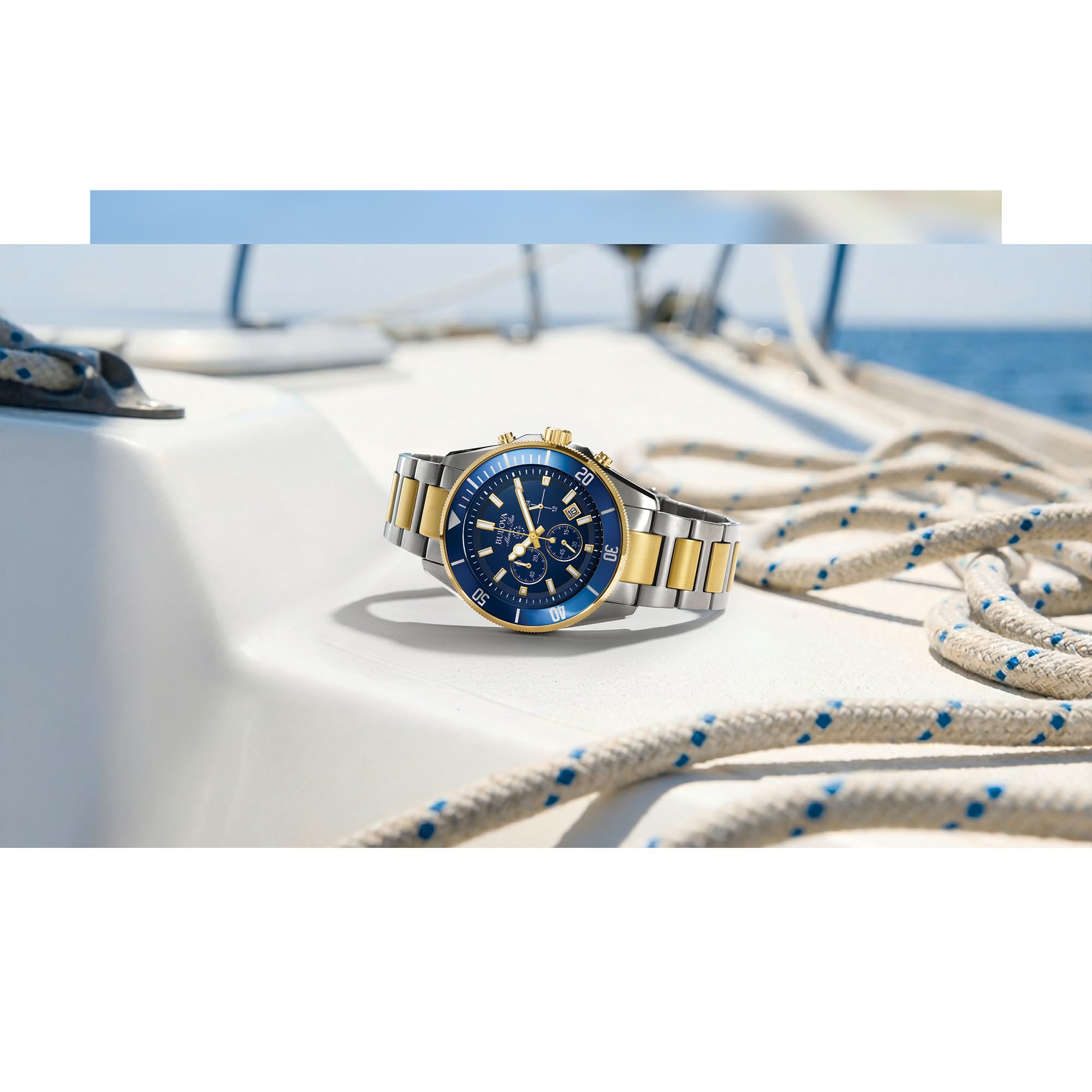 Description Product Description From the Marine Star Collection. High-performance chronograph in stainless steel with two-tone gold and silver ion-plated finish, rotating ratchet bezel, blue anodized aluminum bezel insert, blue sunray dial, luminous hands and markers, calendar, small sweep, screw-back case, and double-press fold-over clasp with extender. From the Manufacturer From the Marine Star Collection. High-performance chronograph in stainless steel with two-tone gold and silver ion-plated finish, rotating ratchet bezel, blue anodized aluminum bezel insert, blue sunray dial, luminous hands and markers, calendar, small sweep, screw-back case, double-press fold-over clasp with extender, and water resistance to 100 meters. Diameter: 43.0mm Thickness: 10.5mm