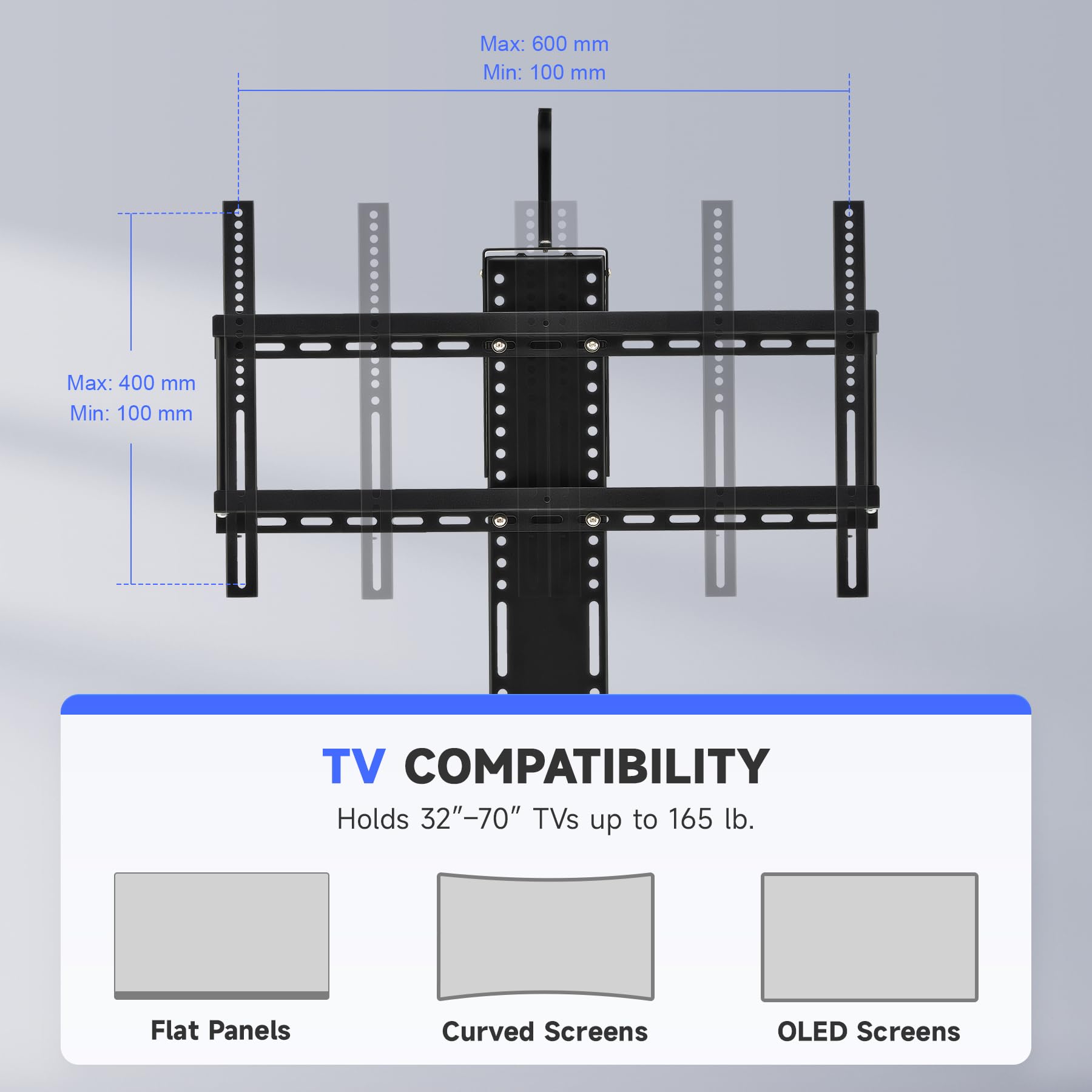 -DURABLE & VERSATILE TV LIFT: This motorized TV mount lift from CO-Z fits 32"-70" plasma, LCD, LED, or OLED TVs up to 165 pounds with flat or curved screens and VESA from 100x100 to 600x400; enjoy unmatched strength and dependability thanks to its heavy-duty construction and fail-safe reinforced design.