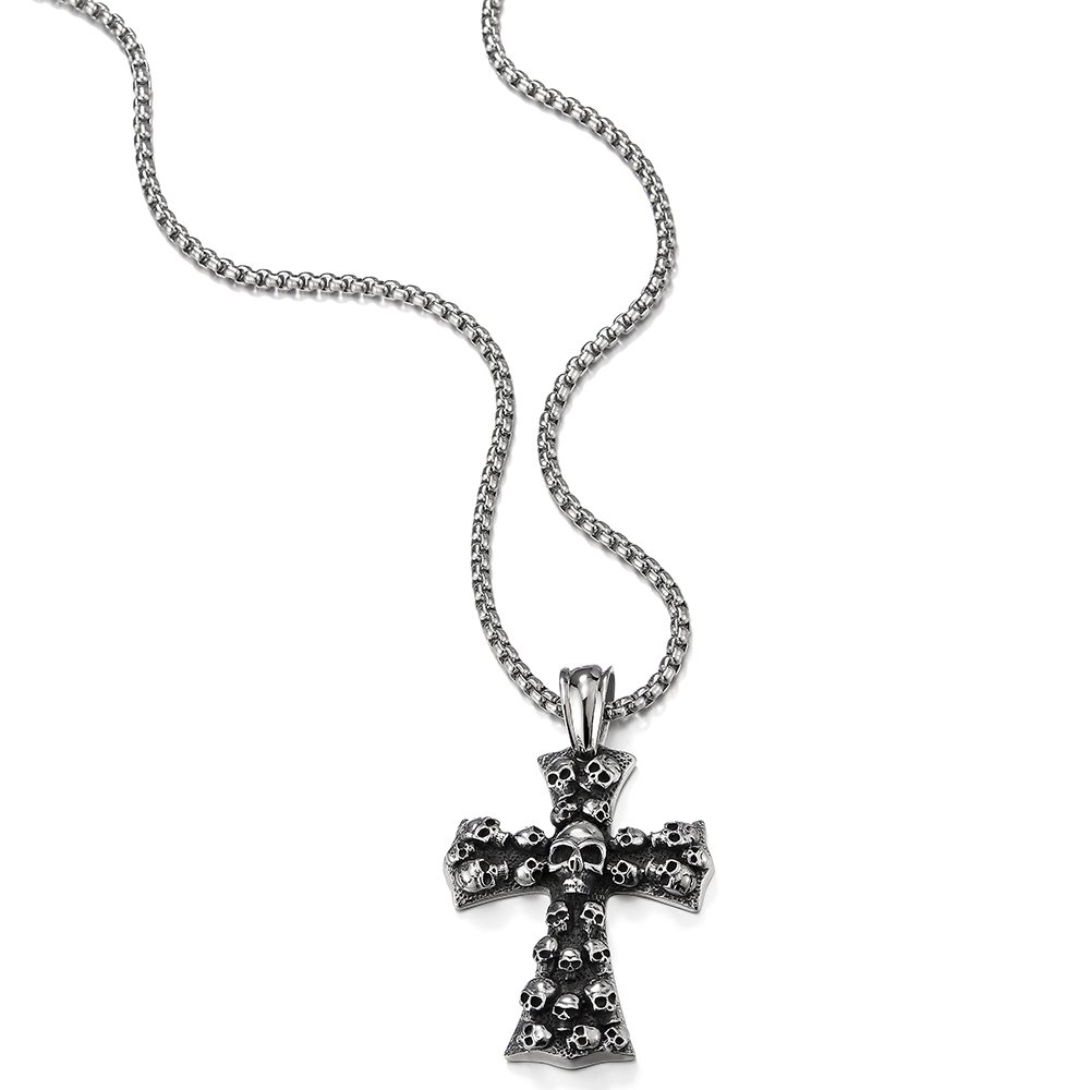 COOLSTEELANDBEYOND Collar con colgante de cruz de calavera de acero inoxidable para hombre con detalle de mini calavera en 3D, acabado oxidado texturizado, estilo gótico motero