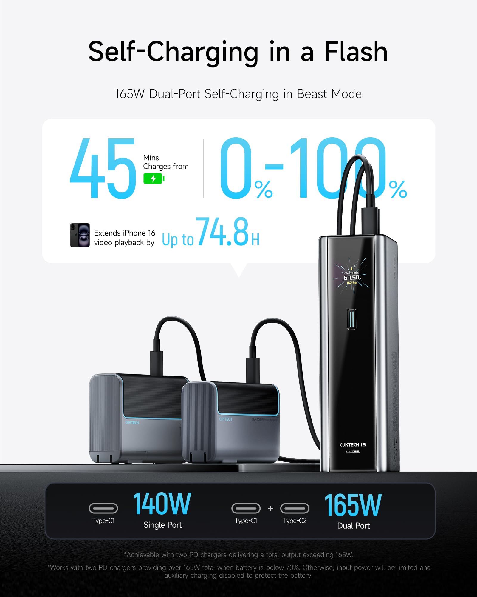 -Powerful 165W Fast Charging Anywhere: CUKTECH power bank delivers up to 165W total output and 140W Max for the C1 port, intelligently distributing power for your devices. Ideal for travel, business trips, or outdoor work, and approved for airline carry-on