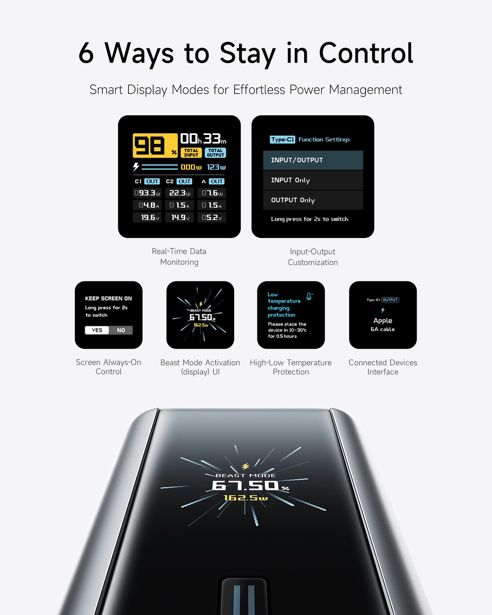 -Wide Compatibility, Universal Fast Charging: Compatible with major fast-charging protocols like PD3.1, QC, PPS, and more, this portable charger powers laptops, smartphones, and tablets, making it the perfect travel companion for any device