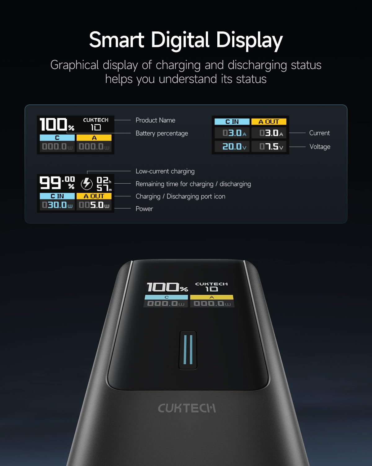 -【100W Maximum Ultra-Fast Charging】Equipped with a USB-C port output, CUKTECH NO.10 power bank offers an incredible 100W MAX power for laptops, up to 30W MAX for iPhones, and 45W MAX for Samsung Galaxy devices. It's the ideal solution for rapidly charging most of your devices and is extremely convenient to carry around, ensuring you're always powered up on the move.