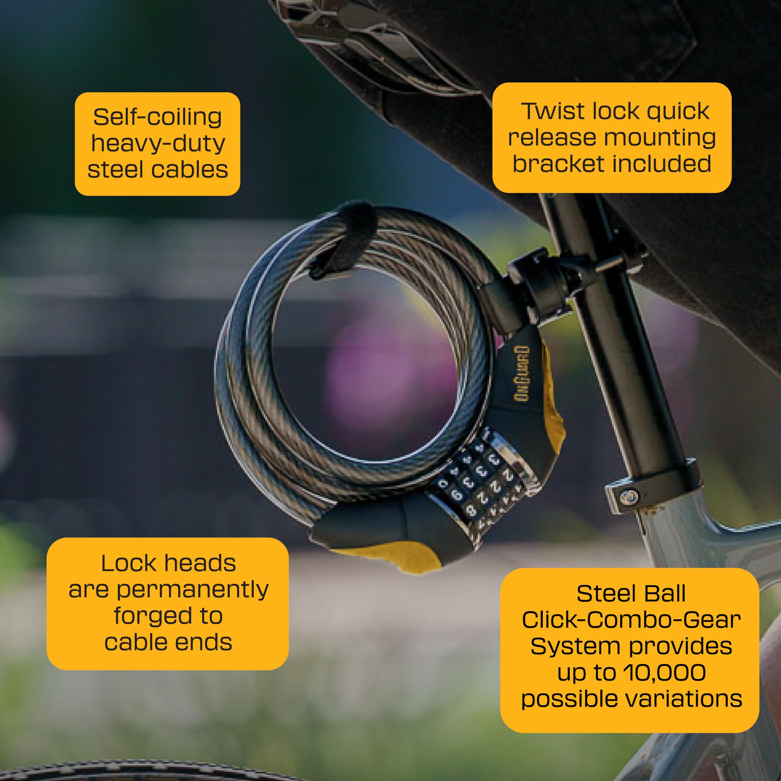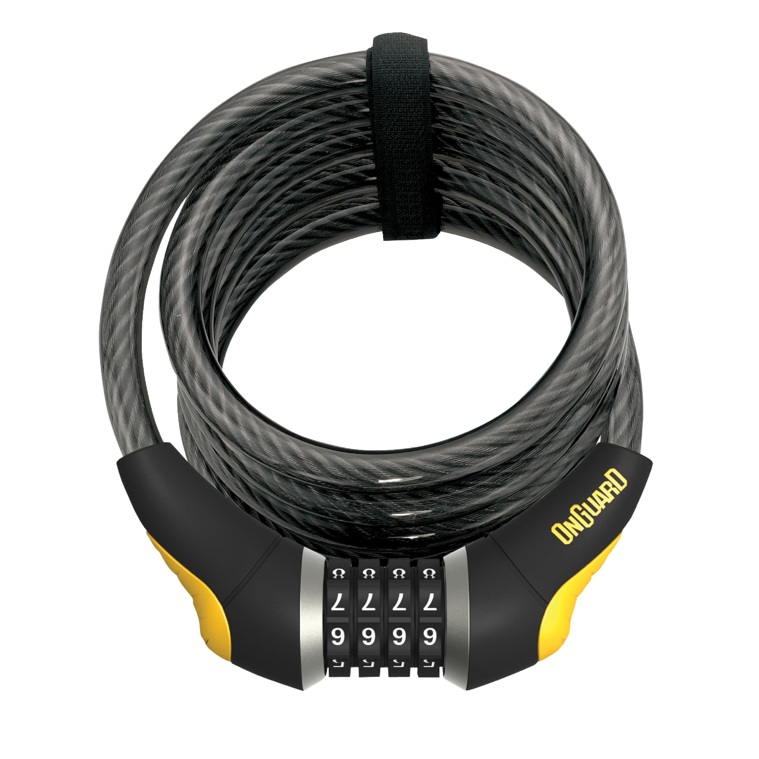 The OnGuard Doberman Combo 6' Coil Cable delivers reliable everyday protection with a 12 mm braided steel cable and user-settable 4-digit Steel Ball combination lock. Its 185 cm (6 ft) length provides flexible locking options around racks or poles, while the vinyl coating prevents scratches on paint or frame finishes. Designed for commuters, city cyclists, and shared-bike users, it includes an All-Tube Twist Lock mounting bracket and reset tool, combining portability, durability, and key-free convenience in one compact package.