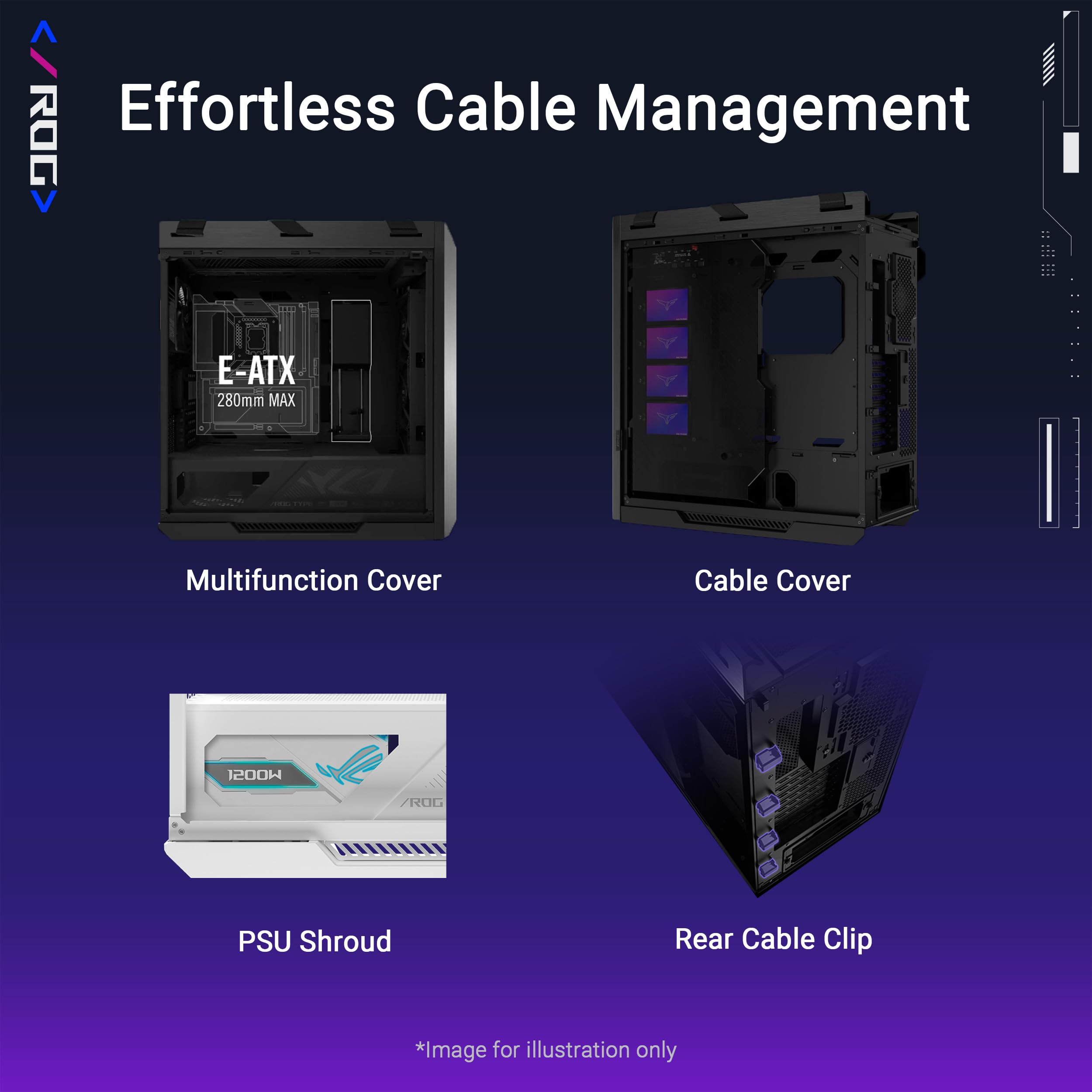 -Tidy PC building: Effortless cable management is enabled by a multifunction cover with graphics card holders, a PSU shroud, a cable cover, and rear cable clips