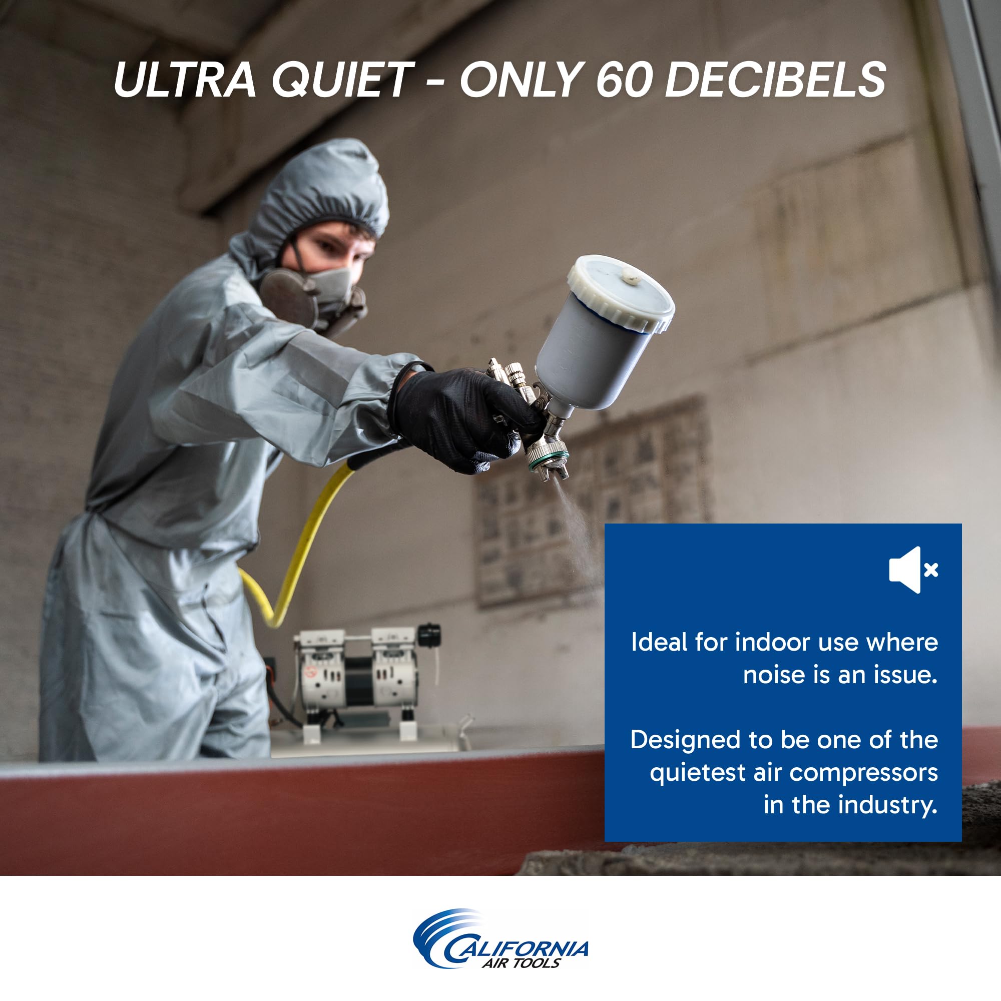 The California Air Tools Ultra Quiet & Oil-Free Air Compressor sets the standard for high-performance air compressors with an industry-leading noise level of only 60 decibels. Perfect for indoor use, this super quiet air compressor allows you to work without the disruption of loud noise, making it ideal for environments where peace and quiet are essential. Its powerful 1.0 HP motor operates at a mere 1680 RPM, resulting in less wear and significantly quieter operation. Engineered with an oil-free Dual Piston Pump System, the California Air Tools oilless air compressor promises exceptional durability and performance. Its robust design ensures a life cycle of over 3000 hours before wear, translating to fewer maintenance issues and uninterrupted workflow. Whether in cold or warm climates, or even uneven terrains, this compressor maintains optimal performance, making it a versatile tool for any project. Weighing just 48 pounds and equipped with a convenient wheel kit, this lightweight air compressor with wheels is remarkably easy to maneuver and position exactly where you need it. From project to project, its mobility ensures that setting up and moving are as effortless as possible. This compressor also includes features such as two pressure control gauges and industrial "Push to Connect" quick connectors, enhancing its ease of use and efficiency. At California Air Tools, we pride ourselves on delivering innovative, top-tier technology in air compressors that meet the needs of both professionals and hobbyists without compromising on power or user-friendliness. Elevate your workspace with the California Air Tools Ultra Quiet & Oil-Free Air Compressor. Discover the bliss of superior performance coupled with whisper-quiet operation, designed to enhance your efficiency and comfort.