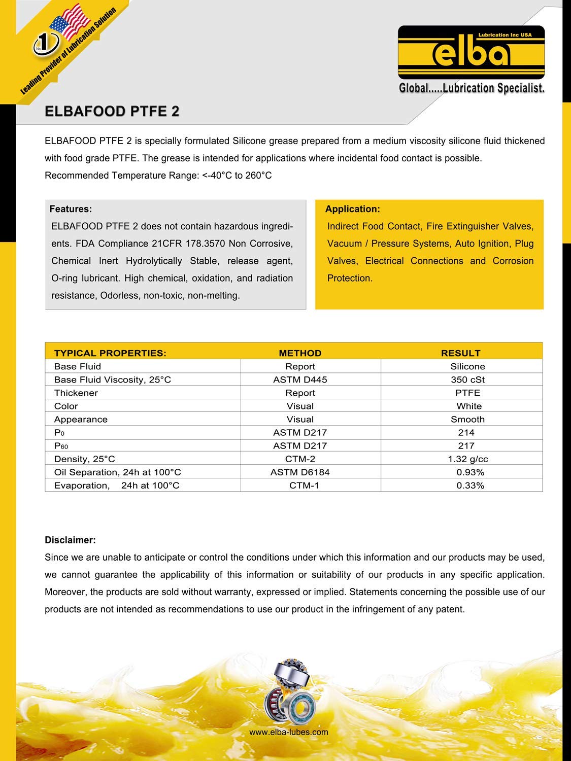 ELBAFOOD PTFE 2 ELBAFOOD PTFE 2 is specially formulated TEFLON Silicone grease prepared from a medium viscosity silicone fluid thickened with food grade PTFE. The grease is intended for applications where incidental food contact is possible.Recommended Temperature Range: <-40°C to 260°C FEATURES: ELBAFOOD PTFE 2 does not contain hazardous ingredients. FDA Compliance 21CFR 178.3570 Non Corrosive, Chemical Inert Hydrolytically Stable, release agent, O-ring lubricant. High chemical, oxidation, and radiation resistance, Odorless, non-toxic, non-melting. APPLICATION: Indirect Food Contact, Fire Extinguisher Valves, Vacuum / Pressure Systems, Auto Ignition, Plug Valves, Electrical Connections and Corrosion Protection.