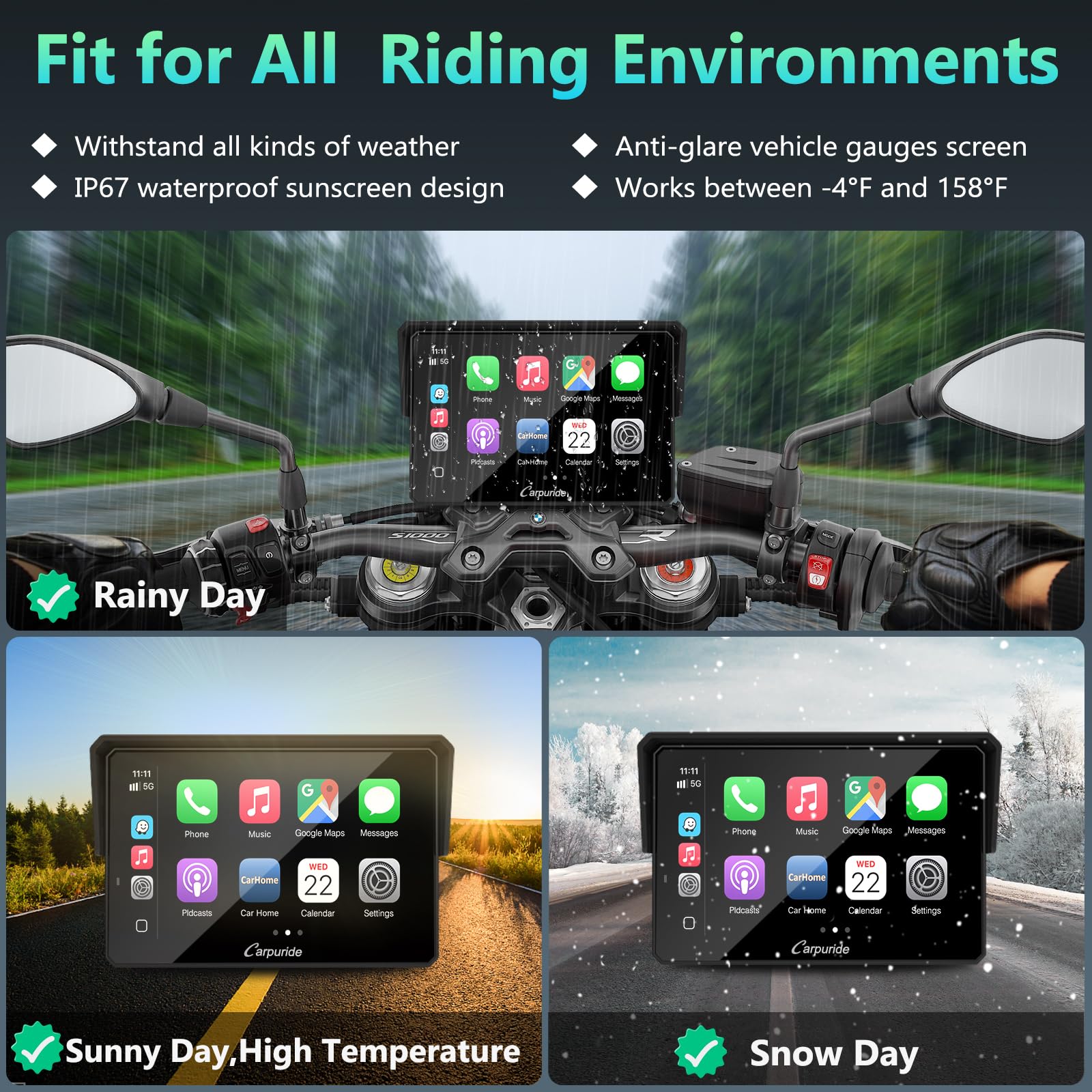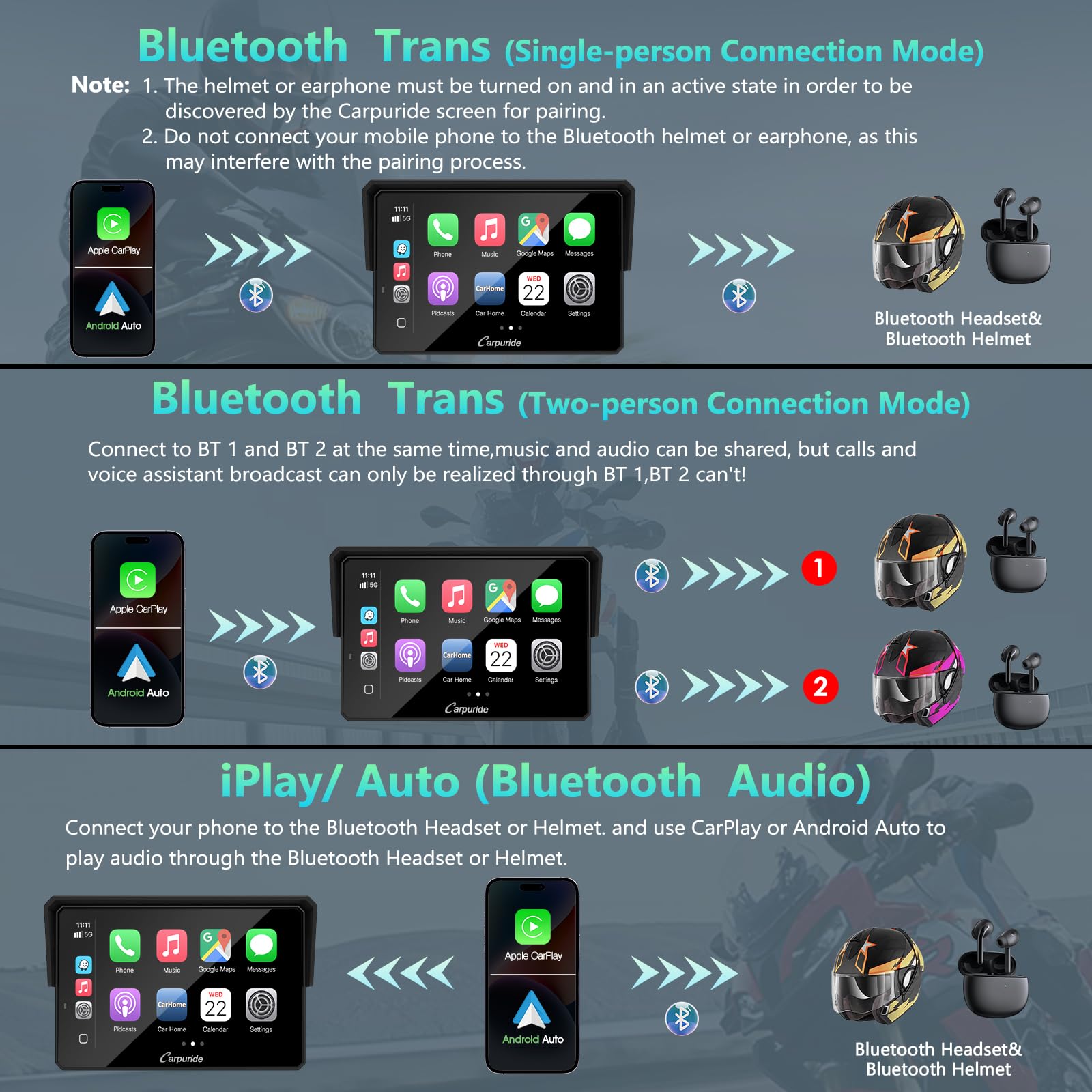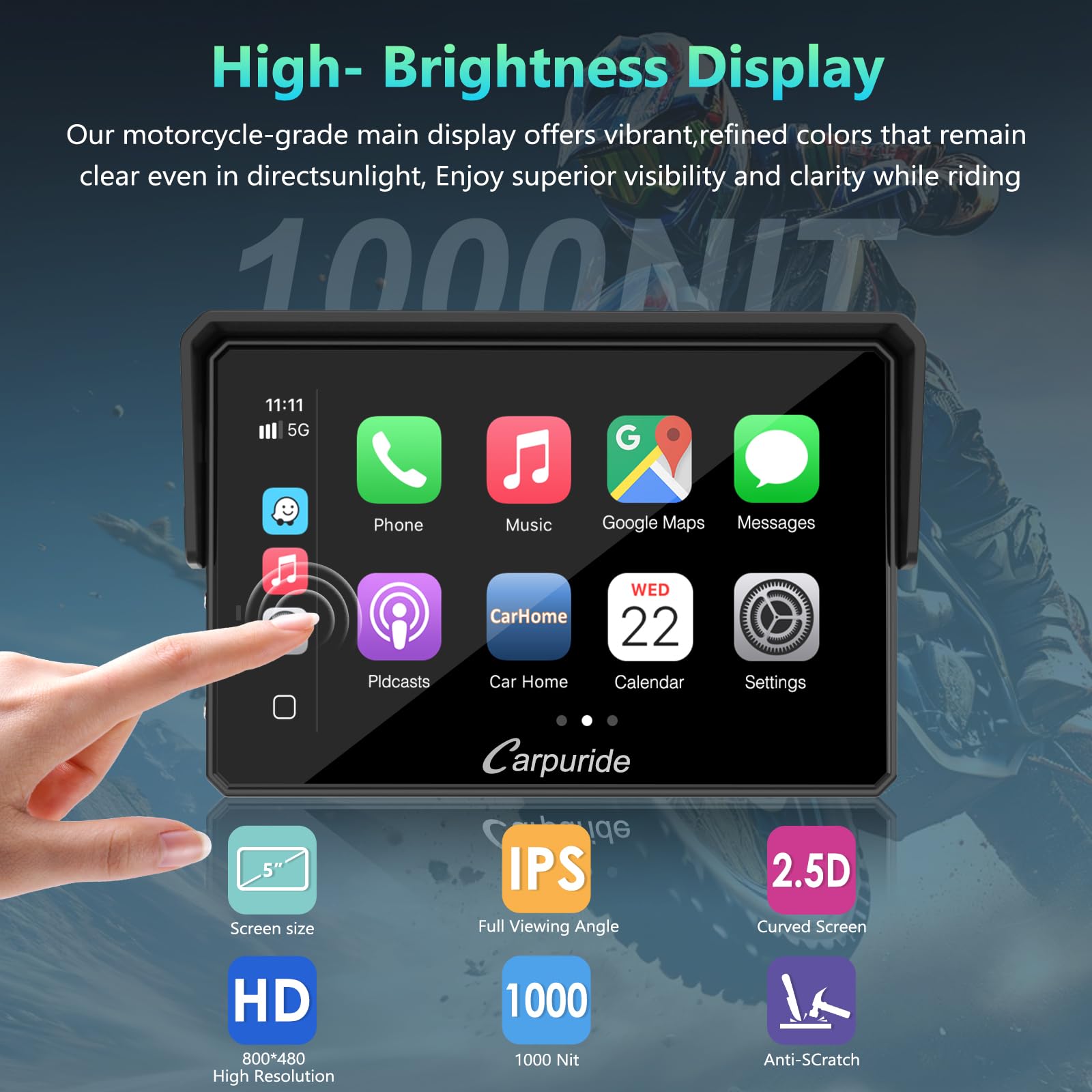 -【Dual Bluetooth - Audio & Transmission】The Carpuride W502bs pro motorcycle GPS CarPlay features built-in dual Bluetooth connectivity, allowing you to pair the CarPlay touchscreen with your smartphone and Bluetooth-enabled headset or helmet. You can make hands-free calls or enjoy your favorite music without removing your helmet. The convenience of dual Bluetooth seamless connection keeps your phone safely in your pocket while you enjoy a free and easy riding experience.