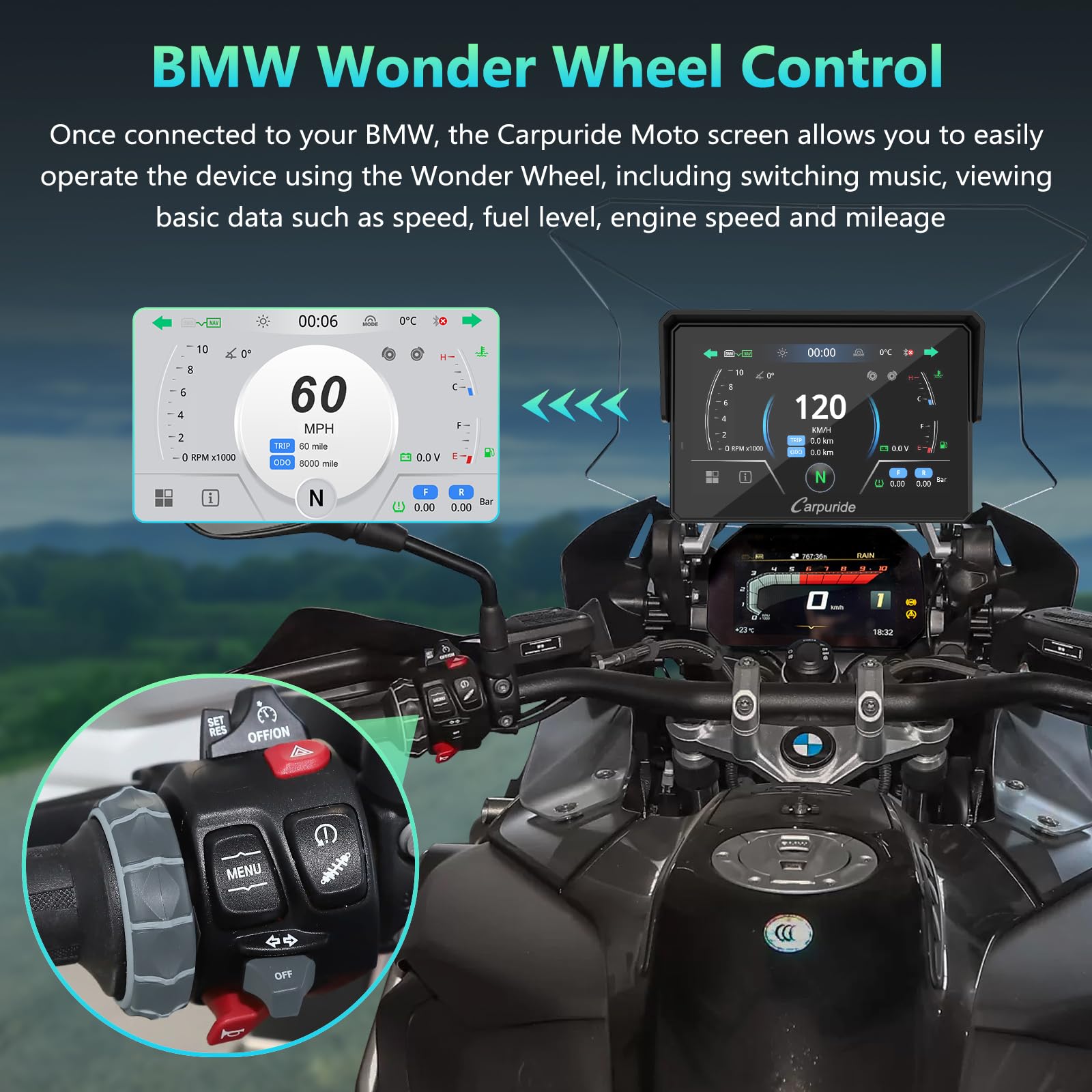 -【Native Wonder Wheel Control】 The BMW Wonder Wheel allows you to effortlessly control the audio display on the W502BS Pro motorcycle, such as TPMS, fuel levels, engine RPM, mileage, and more. The TPMS requires that your BMW motorcycle is equipped with a pre-installed TPMS system. Without it, the TPMS will not be operational. And, please ensure that you are using an original BMW bracket, as third-party mounts are not compatible with the BMW Wonder Wheel Control.