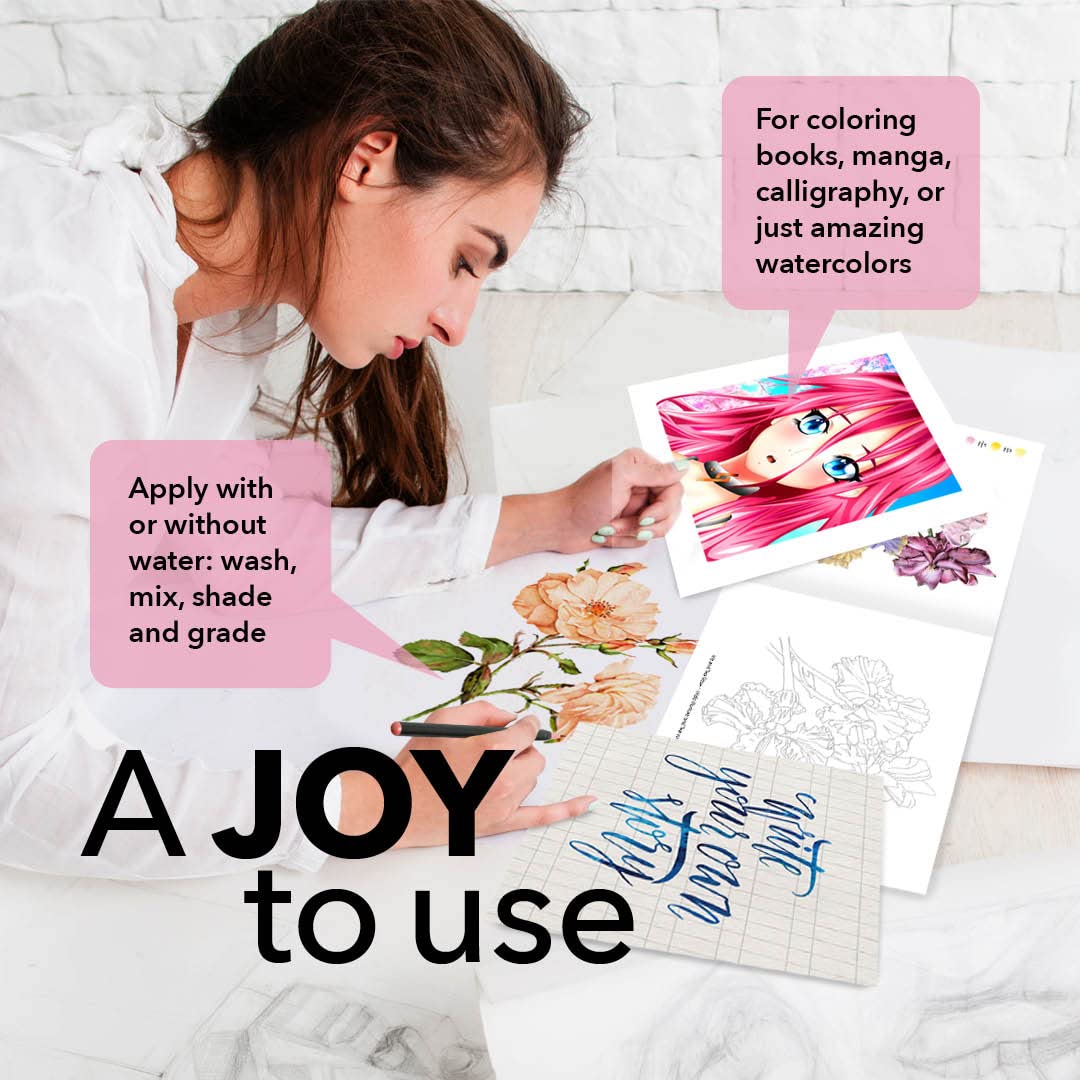 -THE BEAUTY OF WATERCOLOUR In 24 exciting colours, the water-based inks can be used direct, mixed on the palette or with water on paper. Achieve gorgeous watercolour effects: washes, gradients, layering, shading and more.