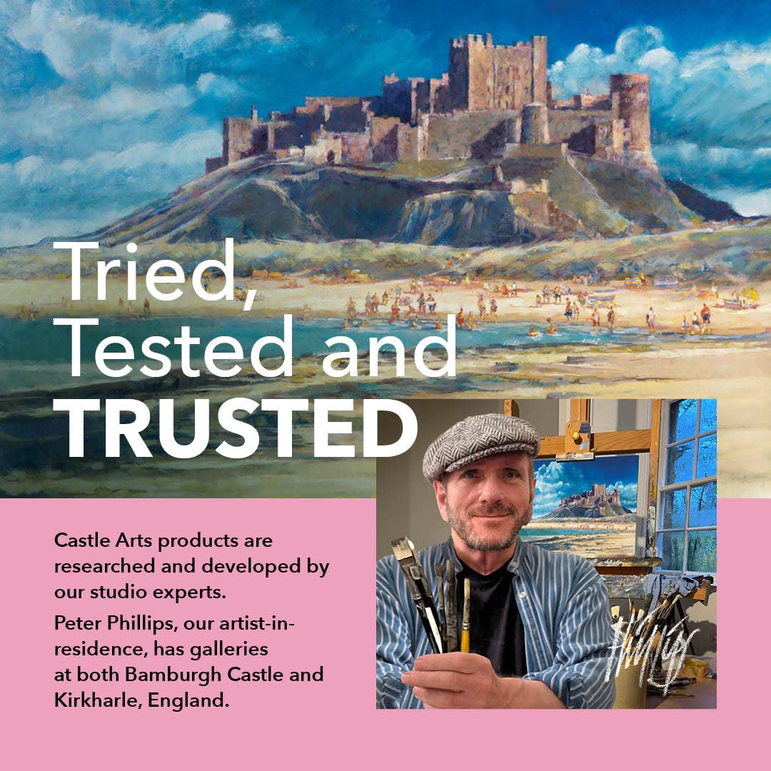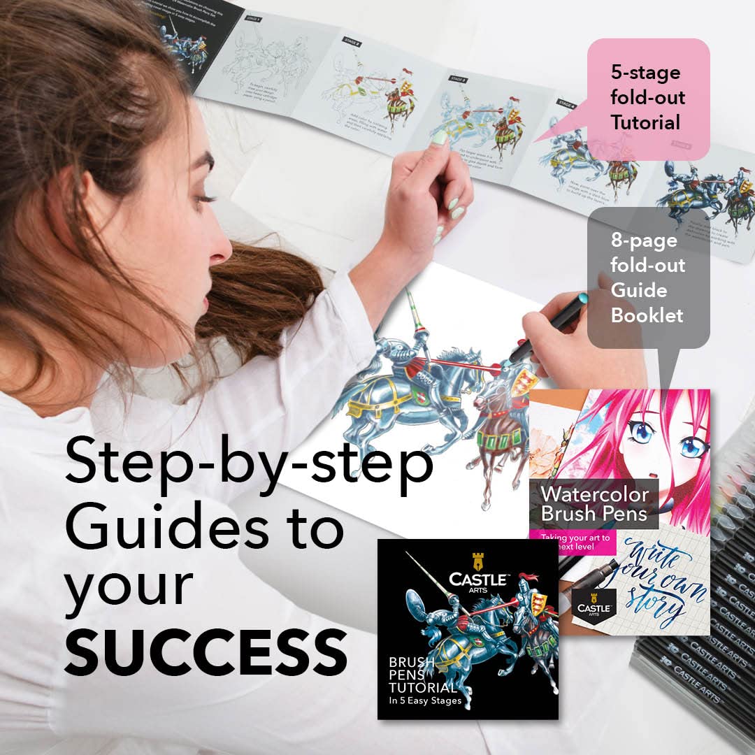 -BUILD YOUR SKILLS 8-page Guide to get you started plus fold-out tutorial so you to get to know watercolour brush pens by re-creating the dramatic jousting knights box illustration on the case sleeve in five easy-to-follow steps.