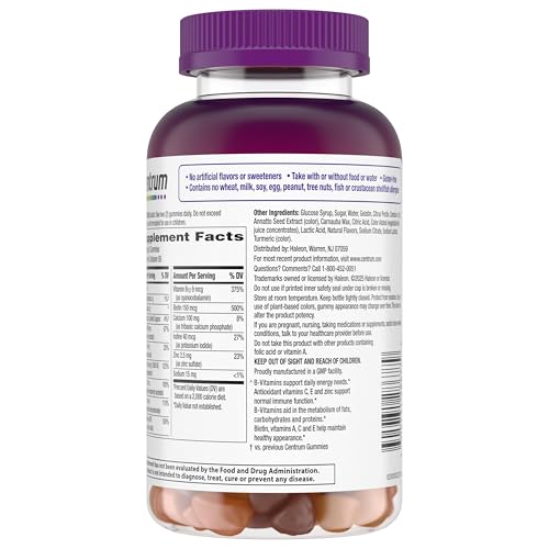 Centrum MultiGummies Gummy Multivitamin for Women is a daily multivitamin/multimineral supplement specially formulated to promote full-body wellness, with 100% of the recommended daily value of vitamins B12, D and biotin in a great-tasting, easy-to-take gummy form. These women's gummy multivitamins contain B vitamins as a metabolism and energy supplement to support your daily needs and help your body process fats, carbohydrates and proteins. Each women's multivitamin gummy also delivers biotin, vitamin A and antioxidants such as zinc and vitamin C for immune support and to help maintain a healthy appearance. With 170 cherry, berry and orange gummies in every bottle, these women's vitamins offer a delicious option to get all the nutrients you need with no artificial flavors or sweeteners. Support your body head to toe by taking two gummies every day with or without food or water. Feed your cells, fuel your life with Centrum, the #1 doctor and pharmacist recommended brand.