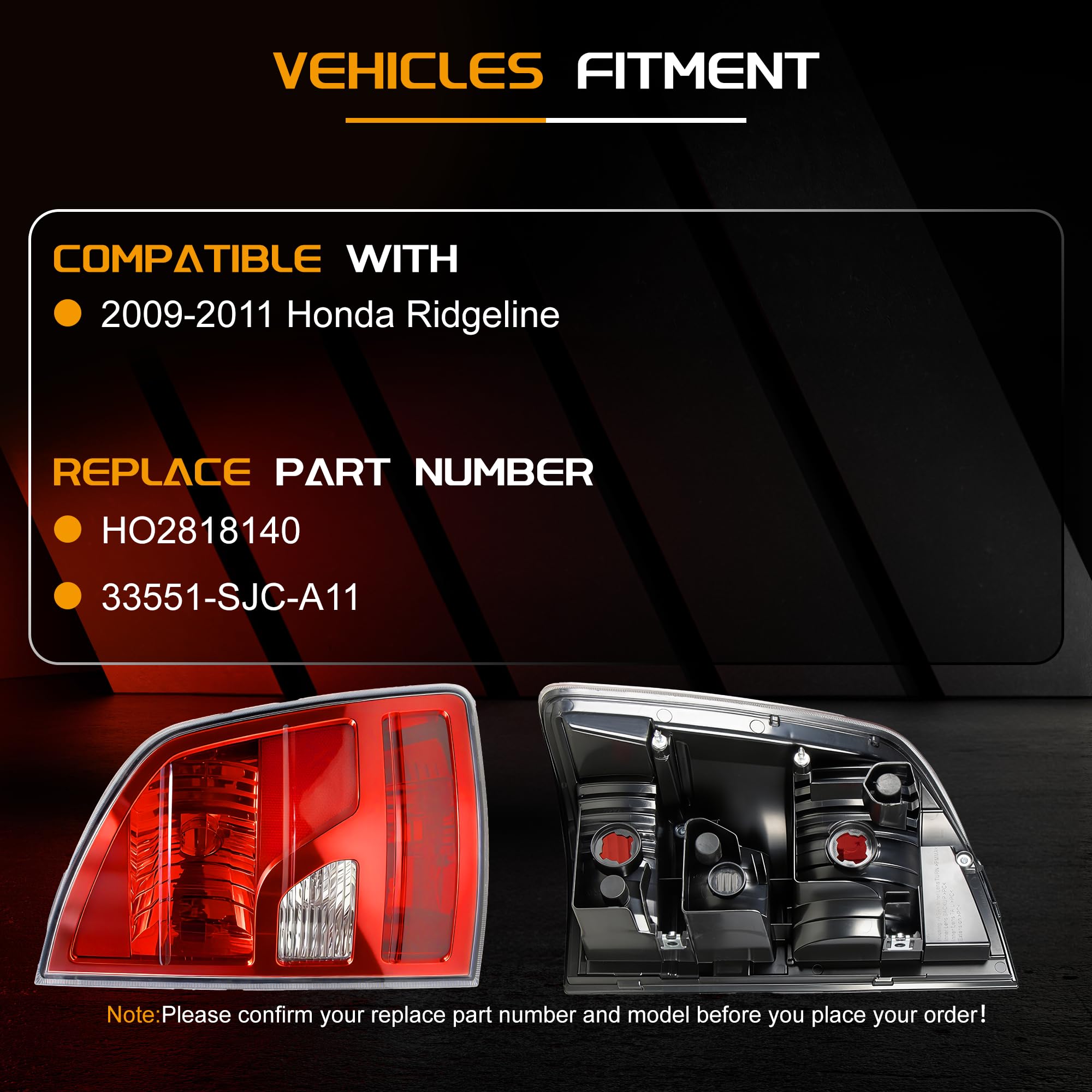 -Replaces Part: Ridgeline Taillight Brake Lamps:HO2818140 33551-SJC-A11. Double-check your OEM part number before ordering