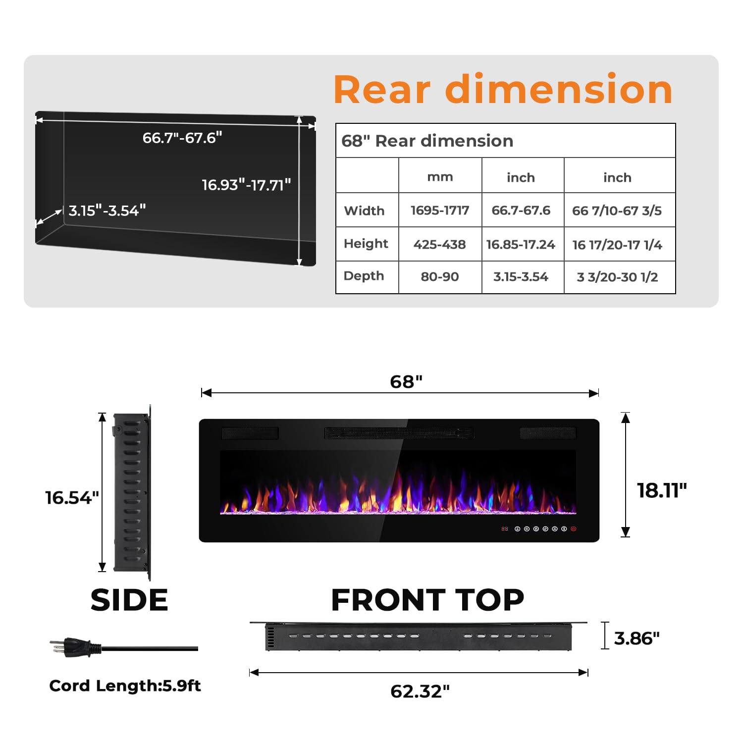 -Multiple Install Methods:This electric fireplace not only can be Recessed or semi recessed in wall but also can be Wall Mounted, This 68-inch-wide electric fireplace only weighs 56.3 pounds, so one person can easily hang it on the wall using the step-by-step instructions provided. Once it has been mounted to your wall, all you need to do is hang and secure your fireplace with the drywall screws. Overall dimensions: 3.86”D x 68”W x 18.11”H