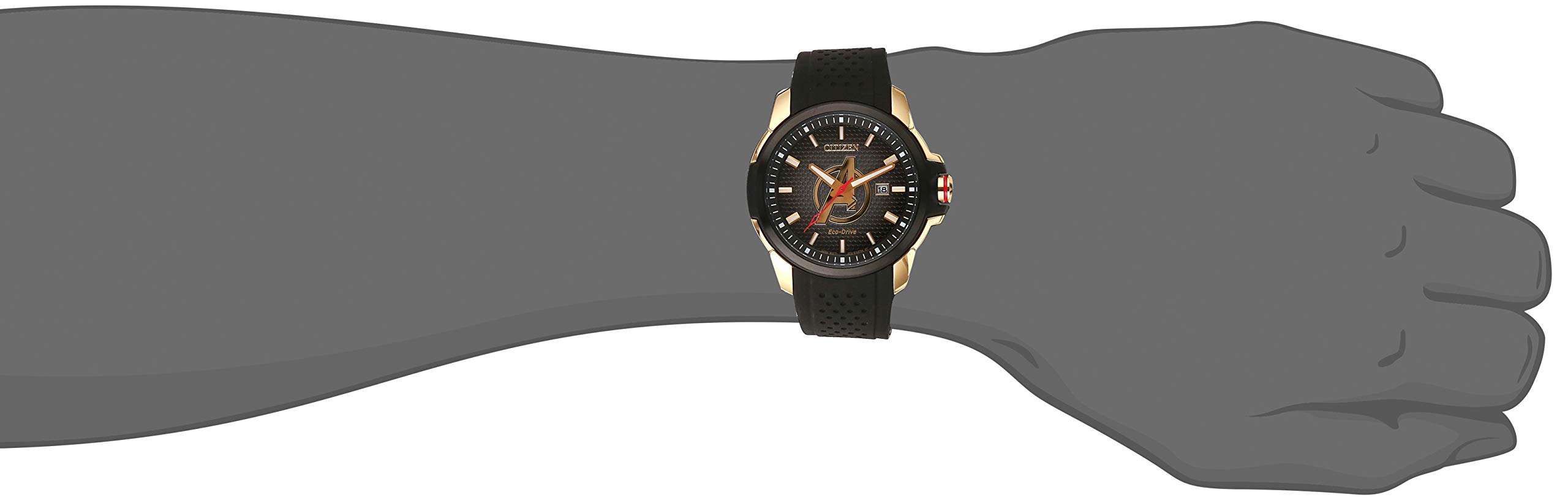 Description Product Description Wear your Super Hero on your wrist with the new Marvel Avengers timepiece by Citizen. The iconic Avengers logo showcased on a black patterned dial within a black ion-plated stainless steel case with a gold-tone chroma finish and black silicone strap with date. Featuring our Eco-Drive technology – powered by light, any light. Never needs a battery. ©2019 MARVEL From the Manufacturer Wear your Super Hero on your wrist with the new Marvel Avengers timepiece by Citizen. The iconic Avengers logo showcased on a black patterned dial within a black ion-plated stainless steel case with a gold-tone chroma finish and black silicone strap with date. Featuring our Eco-Drive technology - powered by light, any light. Never needs a battery. 2019 MARVEL