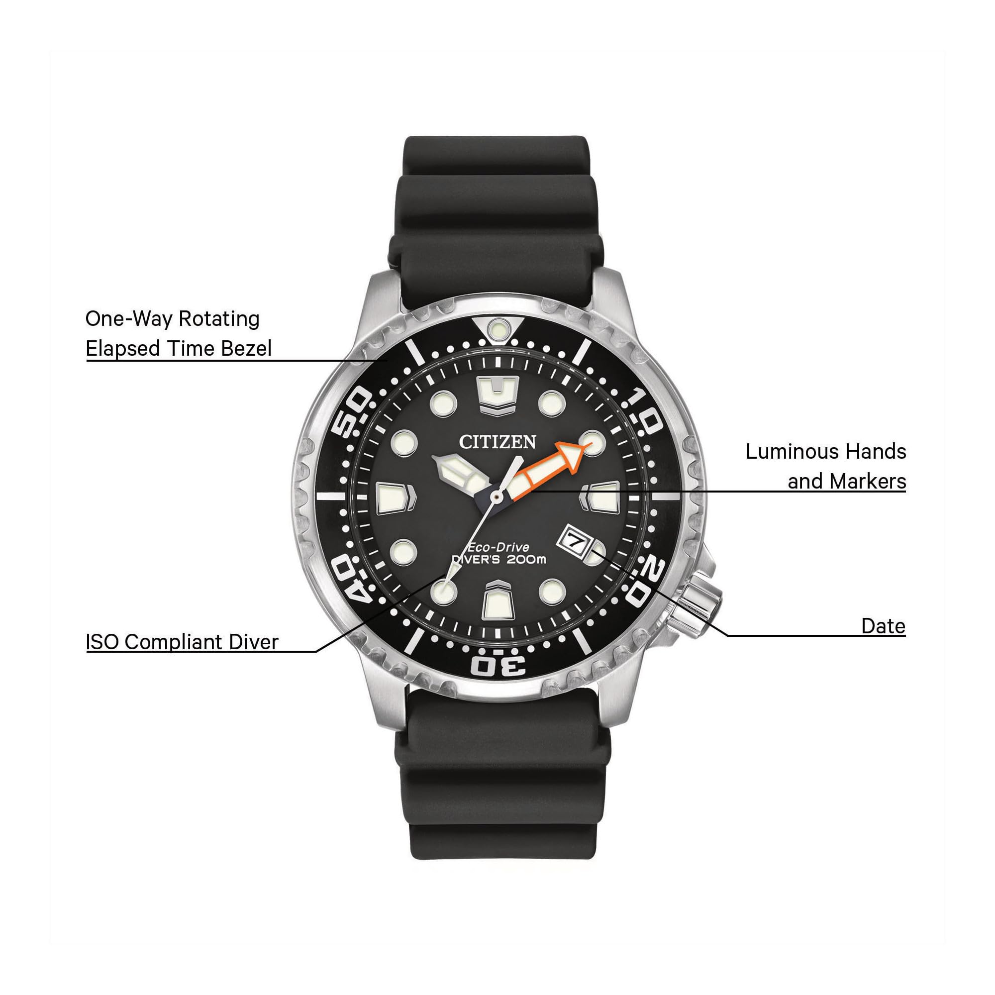 Reloj Citizen Promaster Dive Eco-Drive, fecha de 3 manecillas, certificado ISO, manecillas y marcado