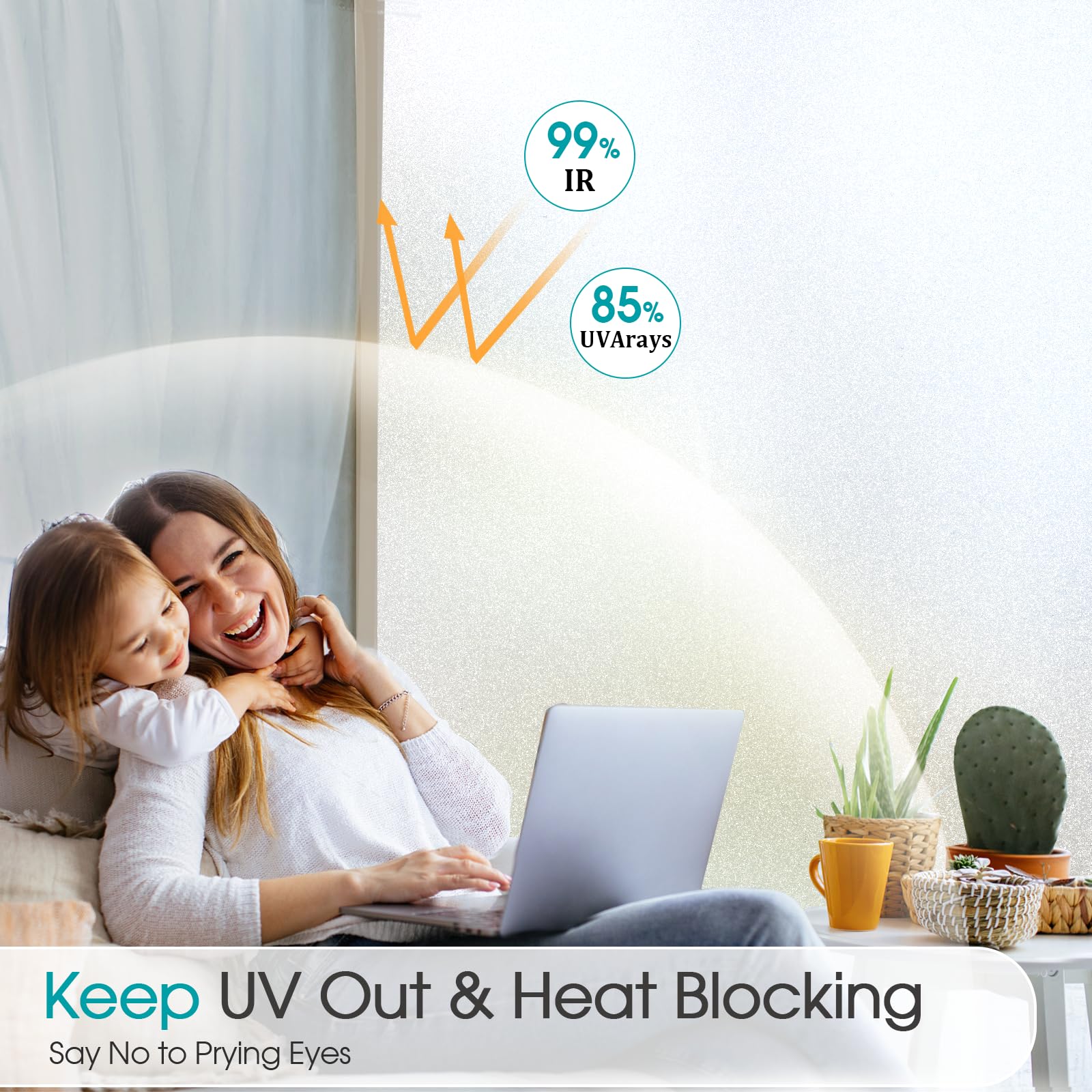 -Heat Blocking Window Privacy Film-- HEAT Blocking & GLARE CONTROL-- This privacy film will drastically reduce heat loss,block moderate glares and 96% harmful UV rays, which may hurt baby's skin, prevent fading furniture and allow soft light for you room.