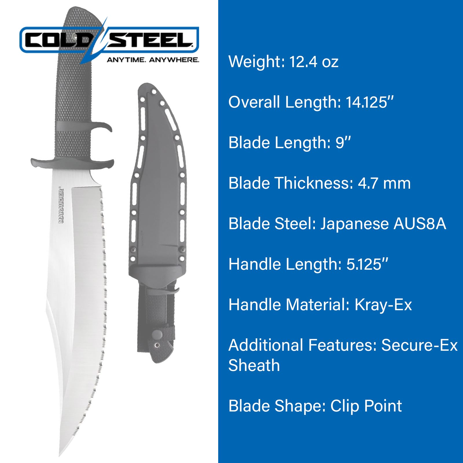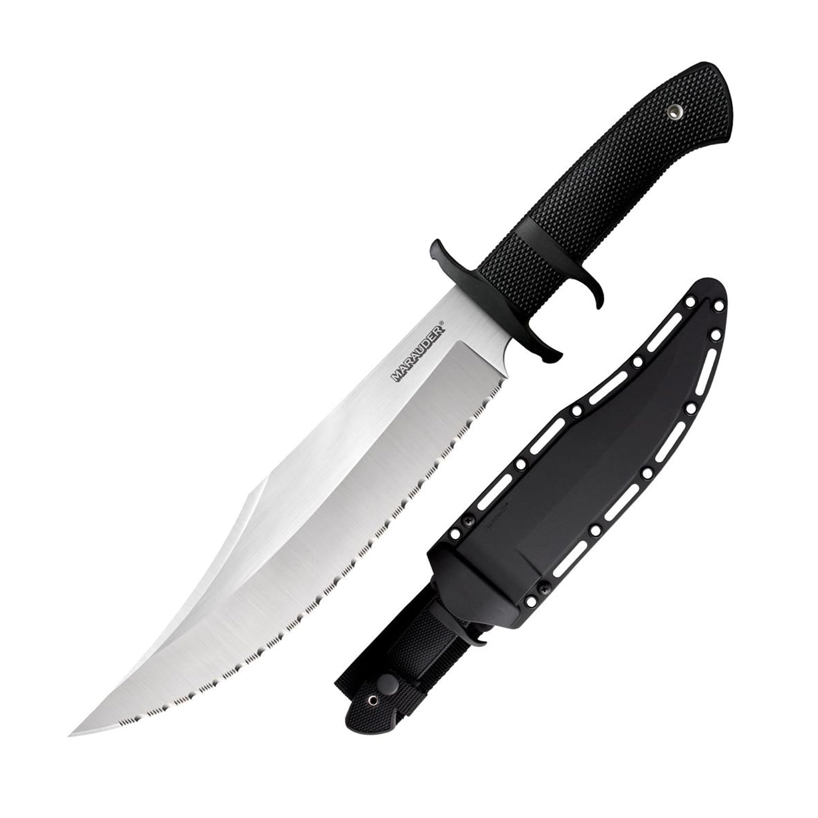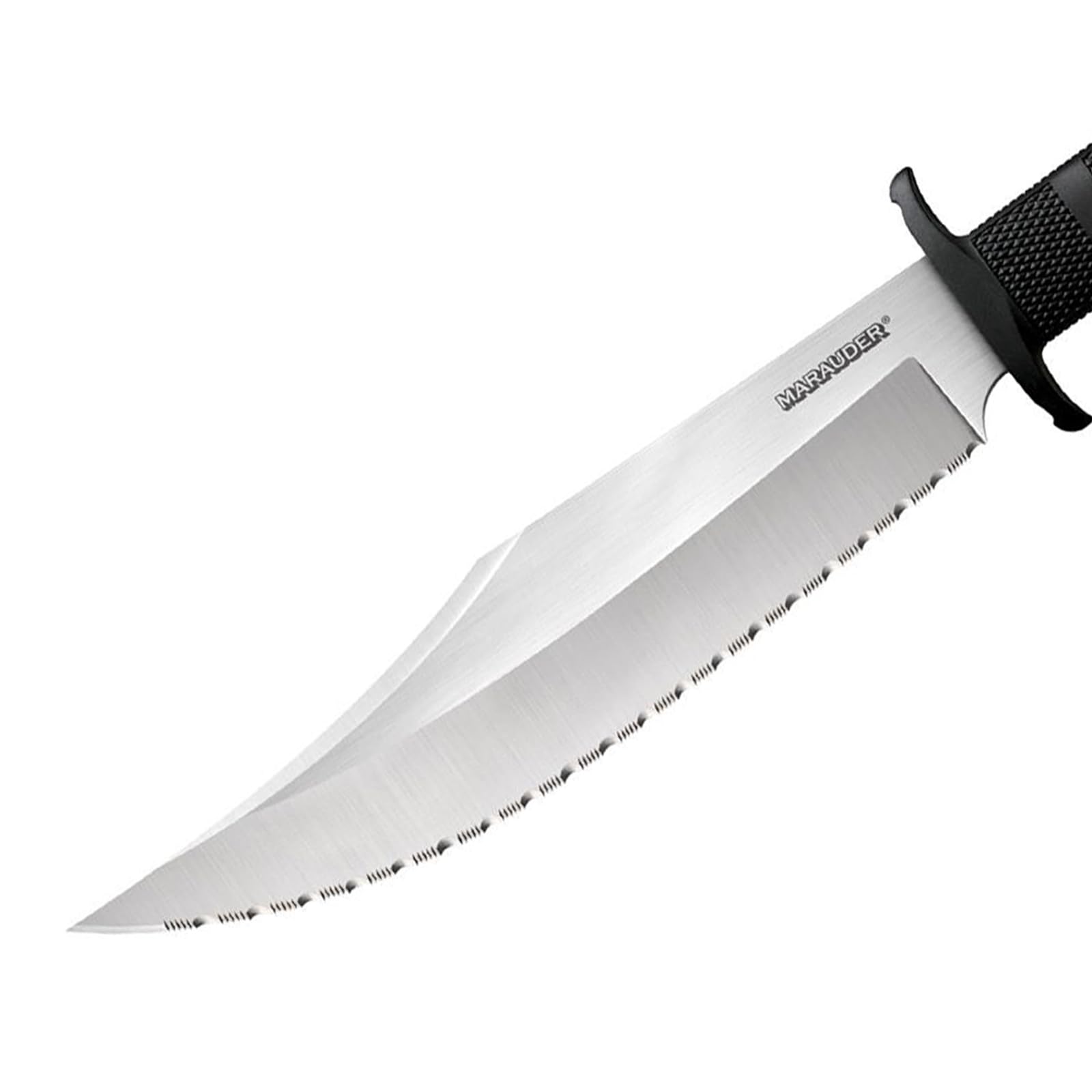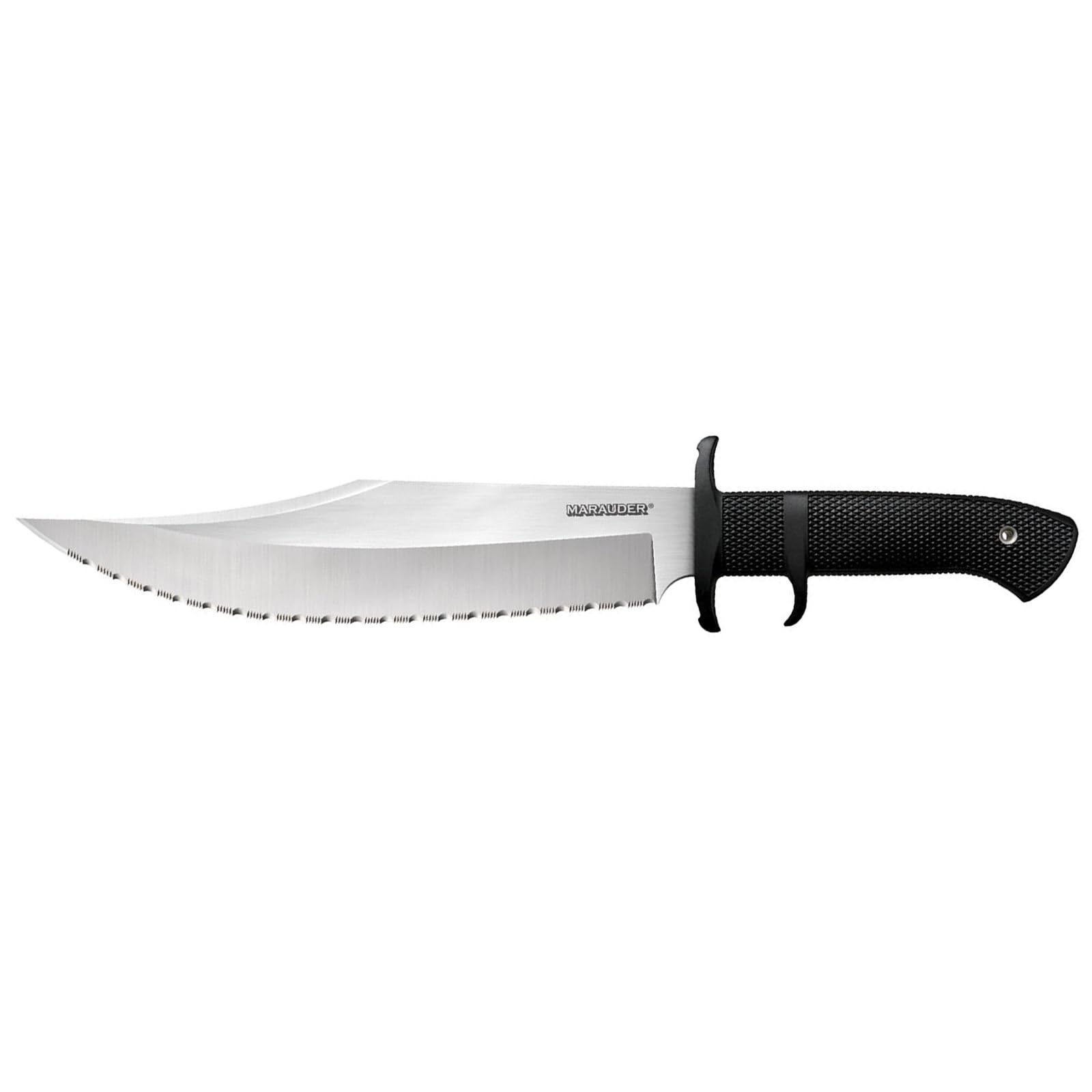 COLD STEEL MARAUDER SUB-HILT FIXED BLADE KNIFE: Honoring the name of Merrill's Marauders - also known as Code name "Galahad", the United States renowned assault unit within the South East Asian Theater of conflict - our Marauder Bowie is rugged, relentless and reliable. It features an extra broad, razor-sharp blade, with a continuously curved edge, deep wide blade bevels, and a formidable clip point. The Kray-Ex handle provides superior durability and non-slip grip. This handle material ensures the knife remains securely in hand, even in wet or adverse conditions. The sub-hilt practically eliminates the possibility of the hand being dislodged or coming into contact with the blade. Plus, the sub-hilt facilitates rapid and effortless withdrawal after insertion. Suitable for many military, survival, and hunting scenarios, the Marauder is equipped with a versatile Secure-Ex sheath allowing the knife to be fastened comfortably and securely on a belt or pack, or LBV. FEATURES: - Japanese AUS8A steel clip point blade; - Available in plain and serrated edge versions; - Kray-Ex handle; - Secure-Ex Sheath. SPECS: Weight: 12.4 oz (351.5 g); Blade Thickness: 4.7 mm; Blade Length: 9"; Handle Length: 5 1/8"; Overall Length: 14 1/8".