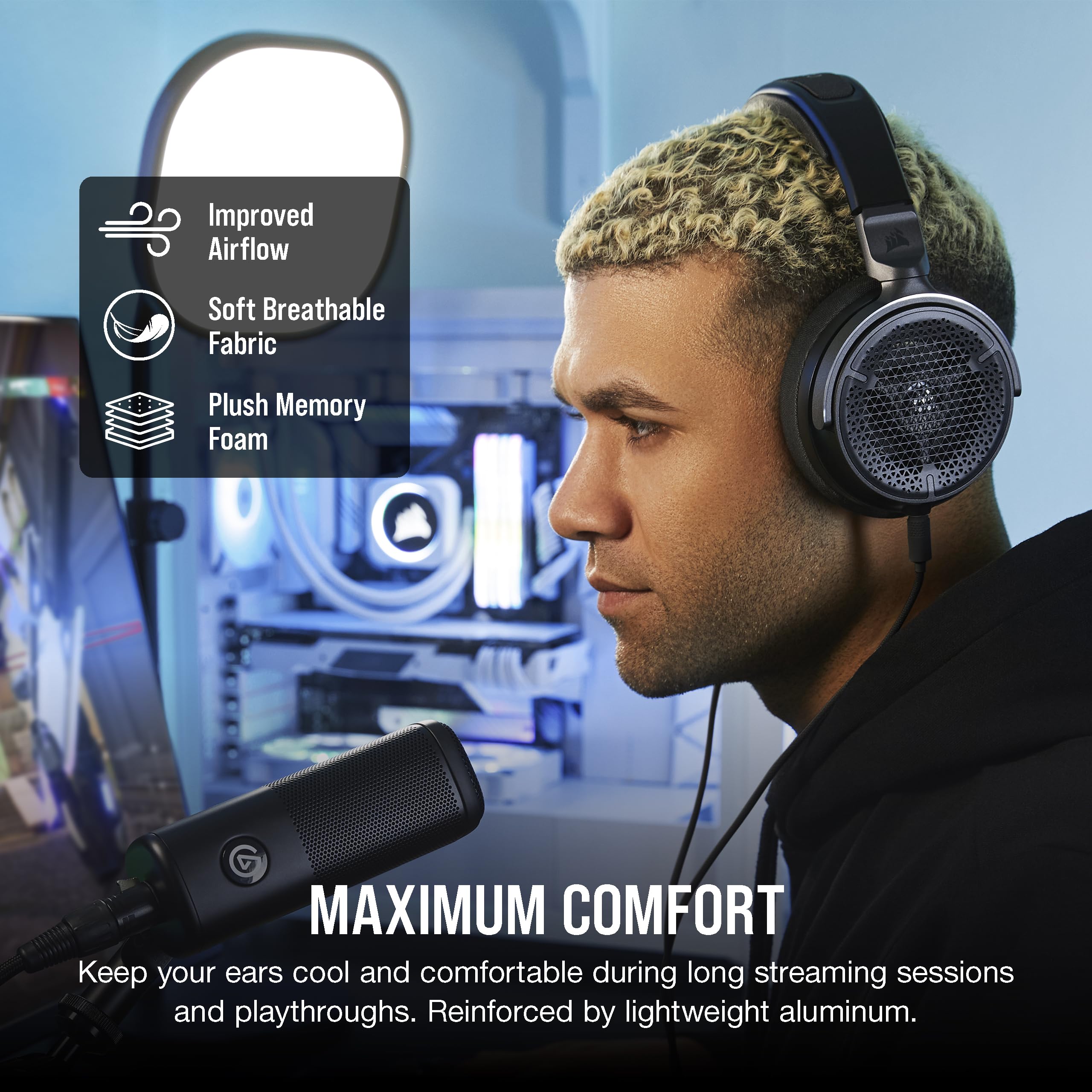 Set the stage for your greatest streaming and gaming moments. VIRTUOSO PRO produces true-to-life audio that lets you catch every important detail. State-of-the-art 50mm graphene drivers faithfully reproduce sounds for radically rich acoustics. And the open back design allows free airflow, creating a spacious, natural sound stage while keeping your ears cool. Hear yourself and your environment clearly through the open ear cups, so you can interact with your audience naturally on the headset’s detachable, noise-canceling microphone. VIRTUOSO PRO rests easy on your head, while soft memory foam ear pads make for luxurious long-form listening and streaming. Hear what matters most with VIRTUOSO PRO.