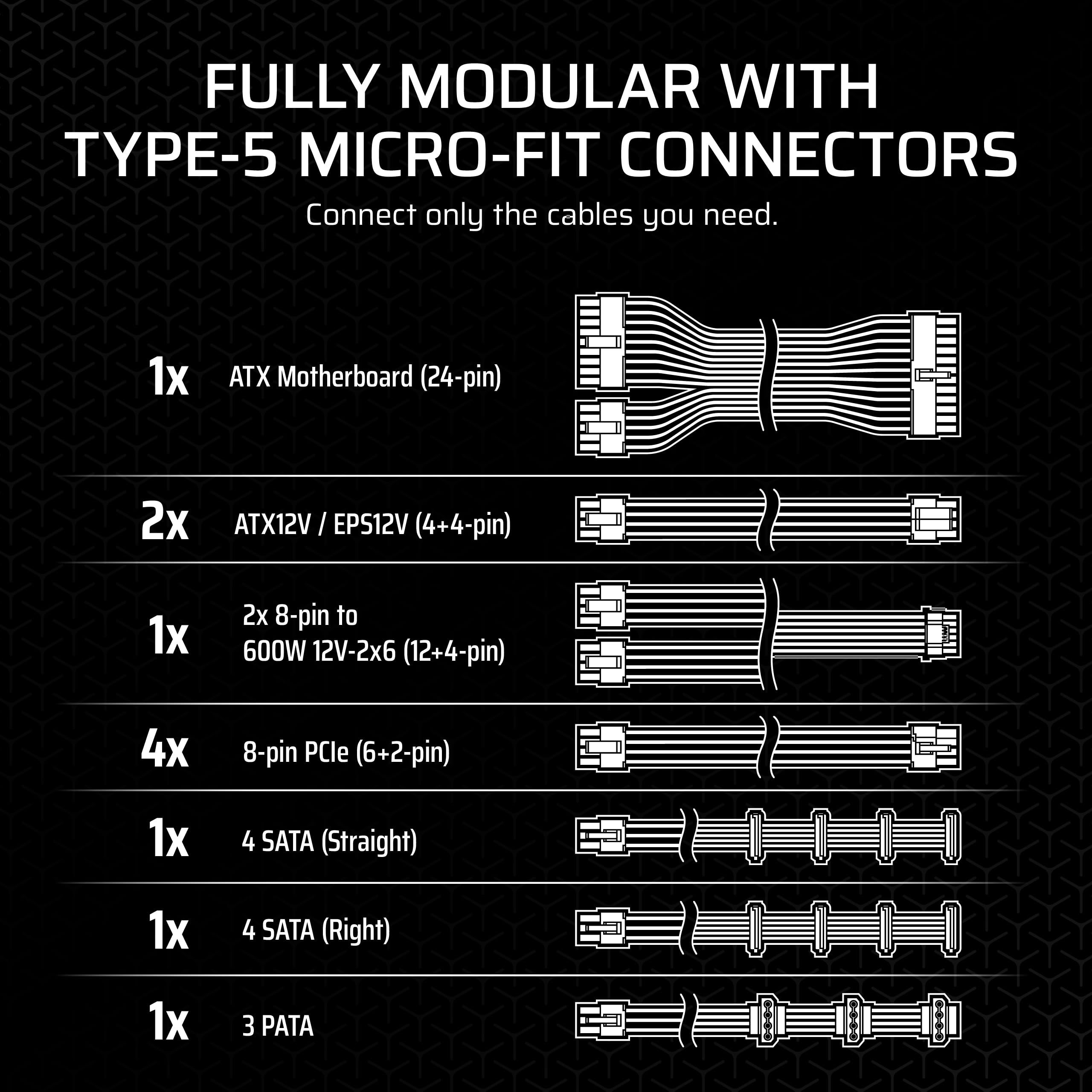-Fully Modular, Type-5 Micro-Fit PSU Connectors: With flexible cabling, taking up less space for tidy cable management and compatibility in small cases