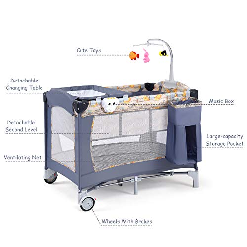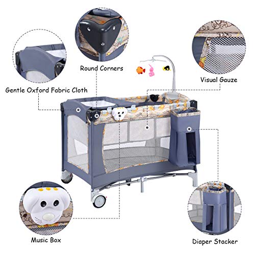 Costzon Baby Playard, paquete portátil 3 en 1 y juego, parque plegable con moisés, cambiador, caja de música, ruedas y freno, canasta, bolsa de transporte Oxford para niños y niñas (gris)