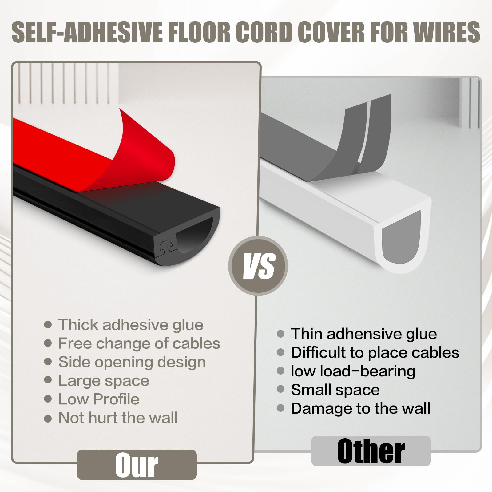 -NO MORE TRIPPING HAZARD: The JAHOMFAI Wire Hider features a smooth bottom and curved top design that fits the wall perfectly. Its low-profile structure makes it easy to walk, vacuum, or roll over. While enhancing the look of your home decor, the cord hider effectively conceals messy cables, providing a safer environment for your family and pets