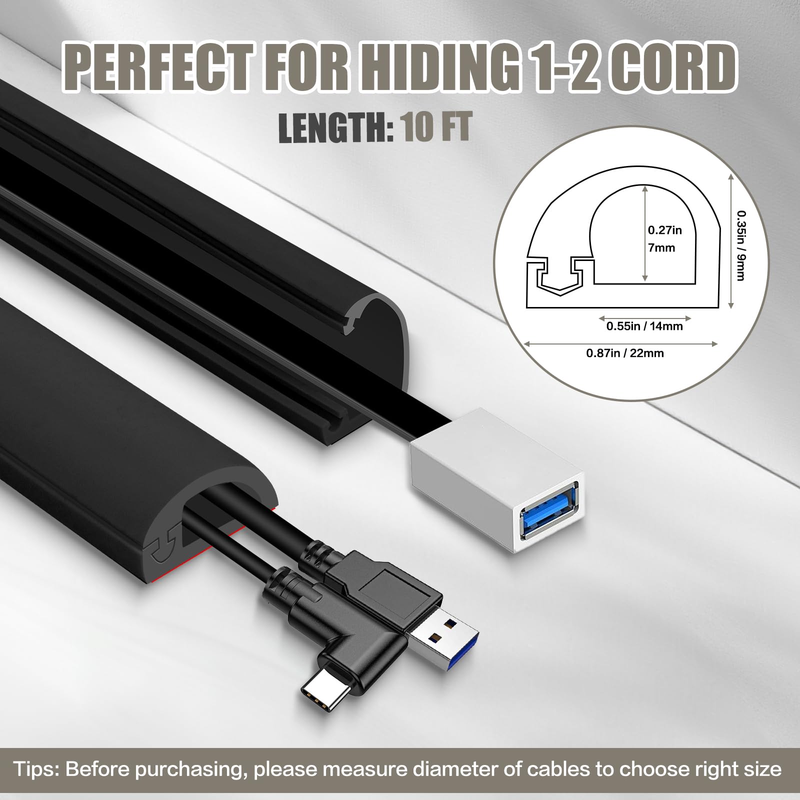 -LARGE CAPACITY: JAHOMFAI Cable hider is perfect for hiding up to 3 USB cables or 2 HDMI cable with its 0.89 inch width and 0.44 inch height. In addition, It’s also ideal for hiding commonly used cables like wall-mounted TV power cords and speaker wires. Please check the outer diameter of your cords or cables before placing your order