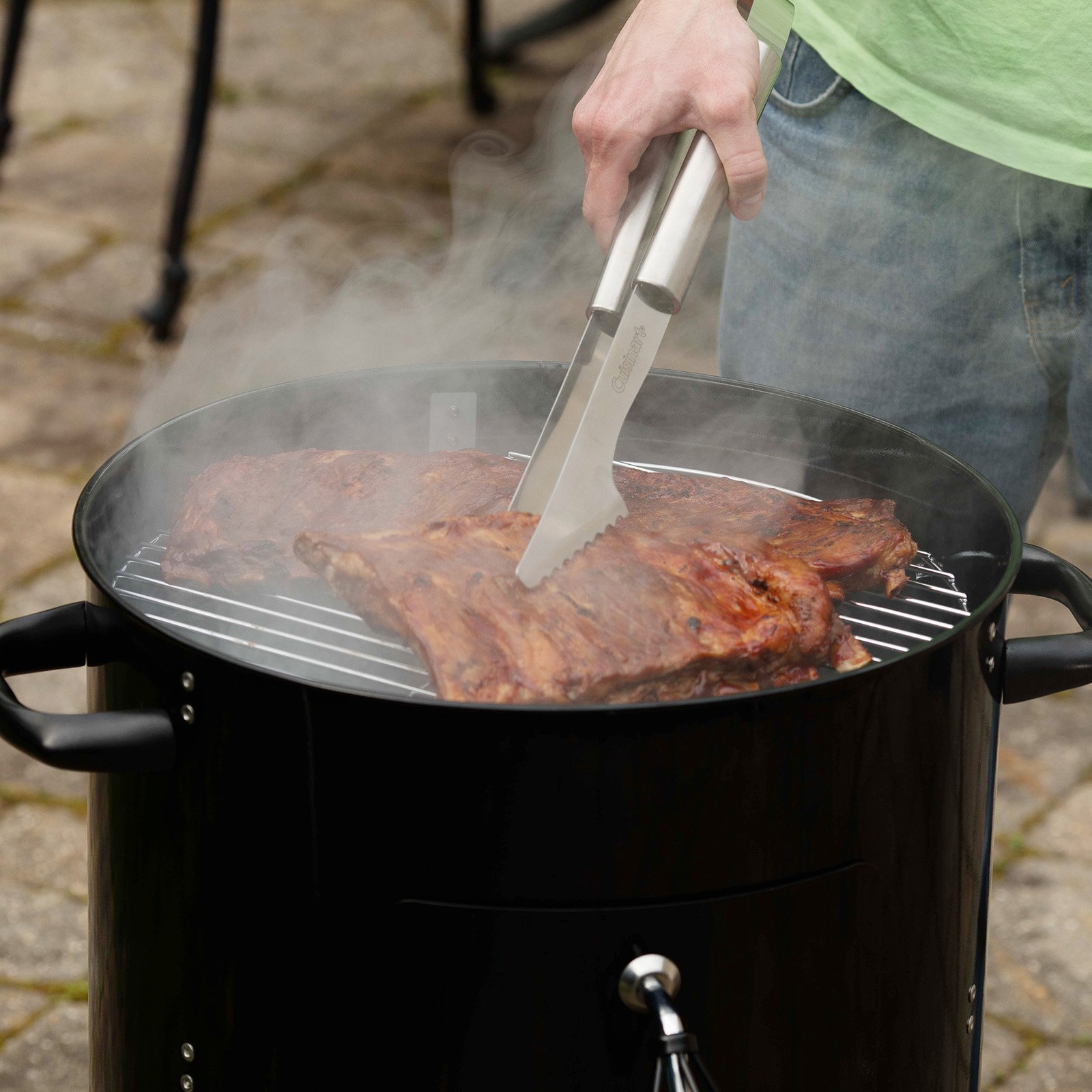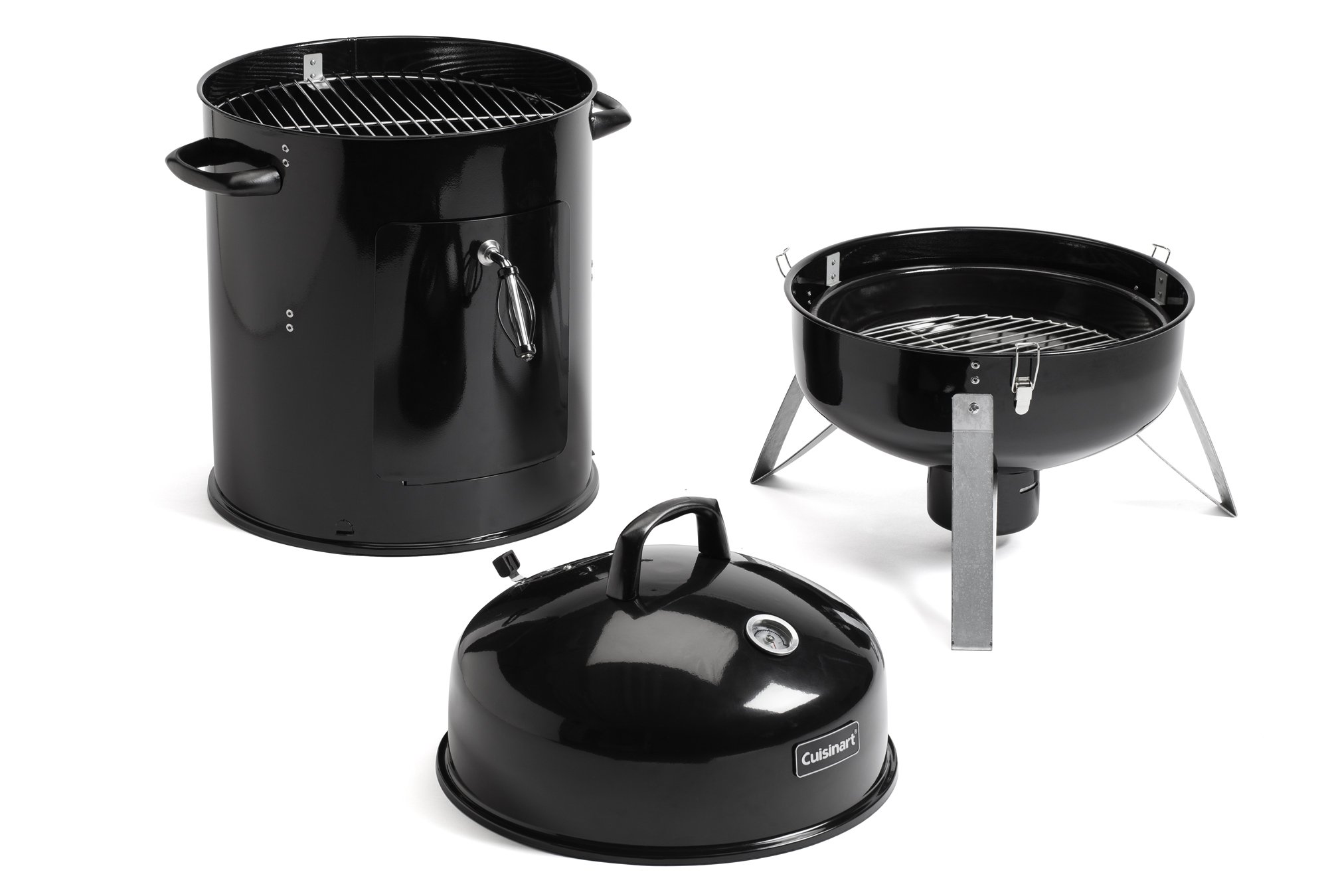 The Cuisinart vertical 16" charcoal smoker was built to last. With two 16" solid steel cooking grates, this smoker can accommodate just about any food you're looking to smoke at the house. Working a charcoal smoker is as simple as lighting the charcoal, filling up the water bowl, & then casually adjusting the air vents to control the temperature. This vertical barrel design makes it easy to keep a consistent temperature with minimal adjustments & accessing the water bowl & charcoal grate doesn't get much easier with this vertically hinged door. When all you need to setup the Cuisinart vertical 16" charcoal smoker is 15 Min & a screwdriver, you'll be smoking your favorite foods in no time!