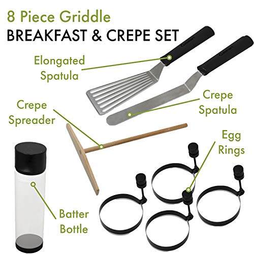 Enjoy the ease of making breakfast on the griddle with the Cuisinart 8Piece griddle breakfast & Crepe set. This set comes with everything you need to make breakfast easy & fun. The battery bottle is easy to use & Features measurements on the side of the cylinder. Whether you are making Pancakes or crepes, the battery dispenser allows you to customize the amount of battery that is poured onto your hot surface. When making crepes, use the crepe spreader to evenly distribute the battery over the surface to make a thin, perfect Crepe. Easily flip your Crepe or pancakes with the thin sides of the crepe spatula. The set also includes 4 egg rings, great for perfectly shaped eggs & Pancakes! The Elongated spatula has beveled edges that slide underneath food making flipping pancakes & eggs easy. The 8Piece griddle breakfast & Crepe set is great for camping, tailgating & backyard fun!