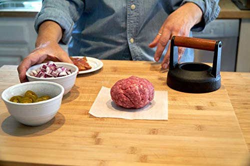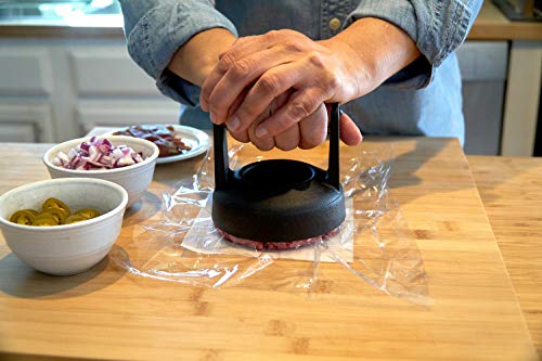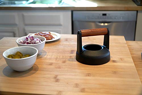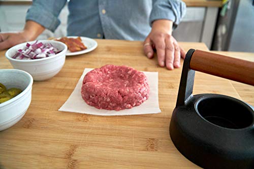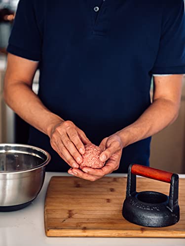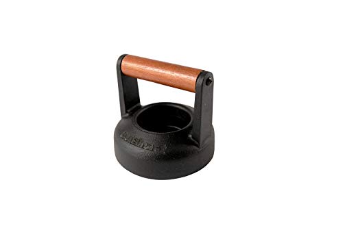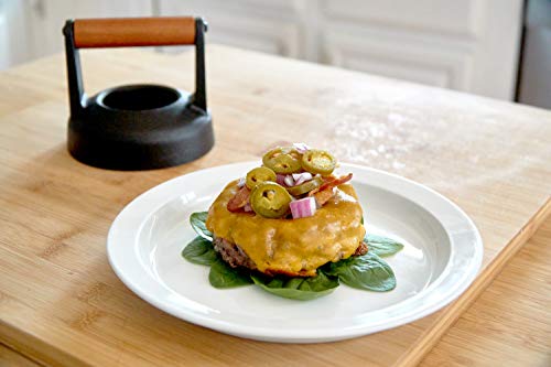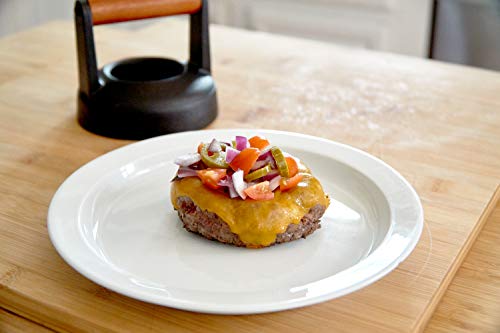 Get ready to experience burgers like you never have before with the Cuisinart Press and Stuff Cast Iron Burger Press! This uniquely shaped press helps bring out the natural flavors of your burgers and allows you to create 1/2 lb. stuffed burgers or low-carb burger bowls. Use the press to form an indent in the center of your burger patty. This allows the juices from the patty to stay in the meat longer during the cooking process giving you a juicy and more flavorful burger. Typical burgers puff up and lose juices as they cook, resulting in a dryer burger. Once you've made the indent, fill up your burger with your favorite toppings and get to cooking. As more and more people shift toward healthier eating options, this burger press is perfect for creating burger bowls that don't require a bun, giving you a low-carb and guilt free option. Rethink the way you do burgers with the Cuisinart Press and Stuff Cast Iron Burger Press!