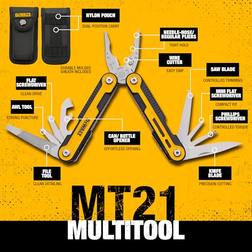 DEWALT Multiherramienta 11 en 1 con funda – Herramienta de bolsillo plegable con cuchillo, alicates, destornilladores, sierra, lata y abridor de botellas – Herramienta EDC compacta para construcción, oficios y uso en el lugar de trabajo