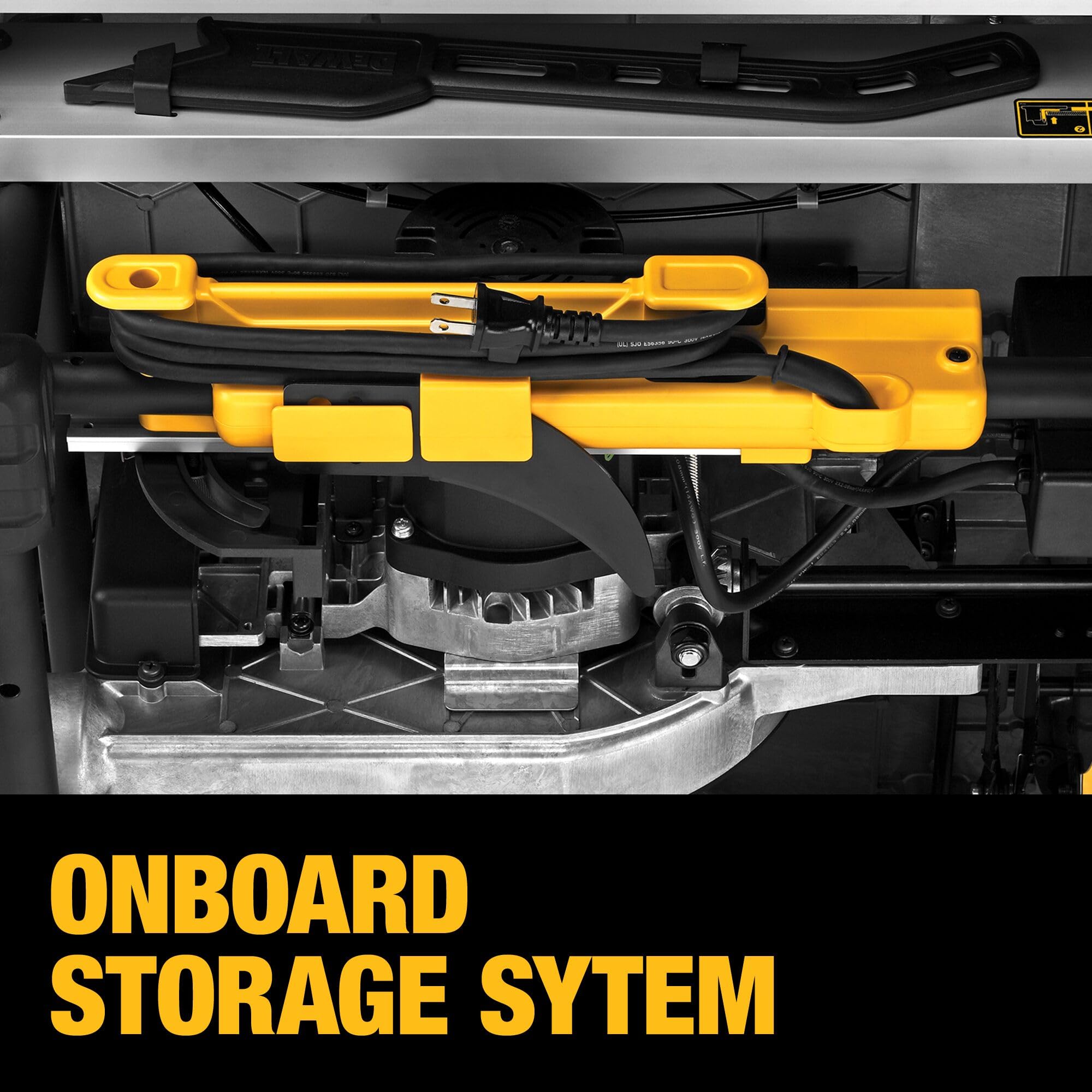 -Onboard storage system provides easy access to the Blade Guard Assembly, fence, riving knife, miter gauge, wrenches, push stick, and cord wrap when not in use.