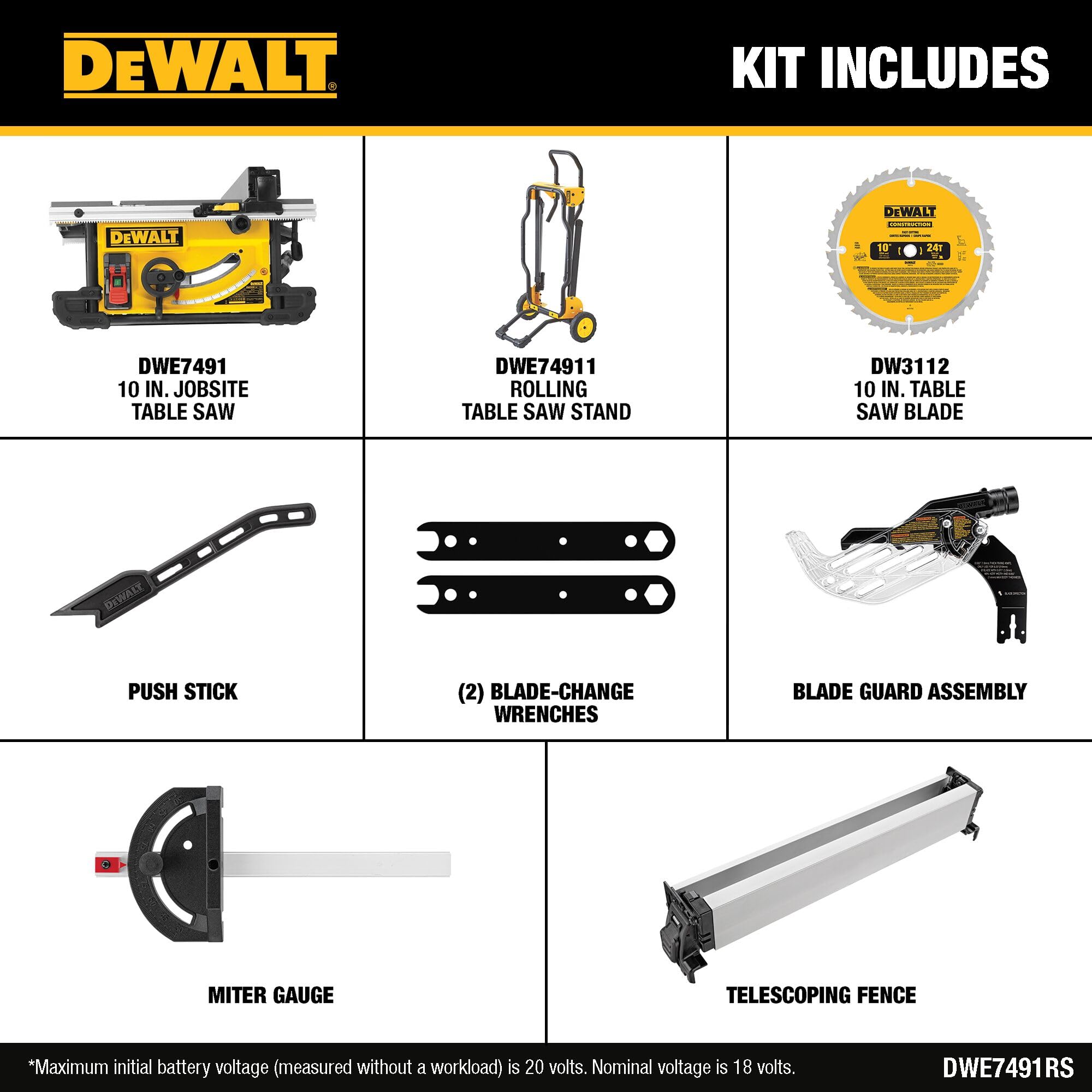 The DWE7491RS 10" Jobsite Table Saw 32 - 1/2" Rip Capacity, and a Rolling Stand has a 15 Amp motor and 32-1/2" rip capacity to allow cutting of large and hardwood materials. Features tool-free guarding component adjustments and fast, accurate fence adjustments. Table saw stand with wheels designed for easy set up and breakdown with excellent stability. Common Applications: Cabinet Installers: ripping filler boards. Hardwood Floor Installers; ripping floor boards. Trim Carpenters: ripping moldings, wainscoting, ripping and cross cutting 1 X material for framing book shelves and entertainment centers, ripping framing lumber. Deck Builders: ripping deck boards, rail cap, railing. Remodelers; ripping framing lumber, sheet material (4' X 8') Serious Woodworkers: home hobbyists, ripping sheet material (4' X 8'), framing lumber, 2" X 12"), sizing material up to 3" thick, ripping and cross cutting 1X material.