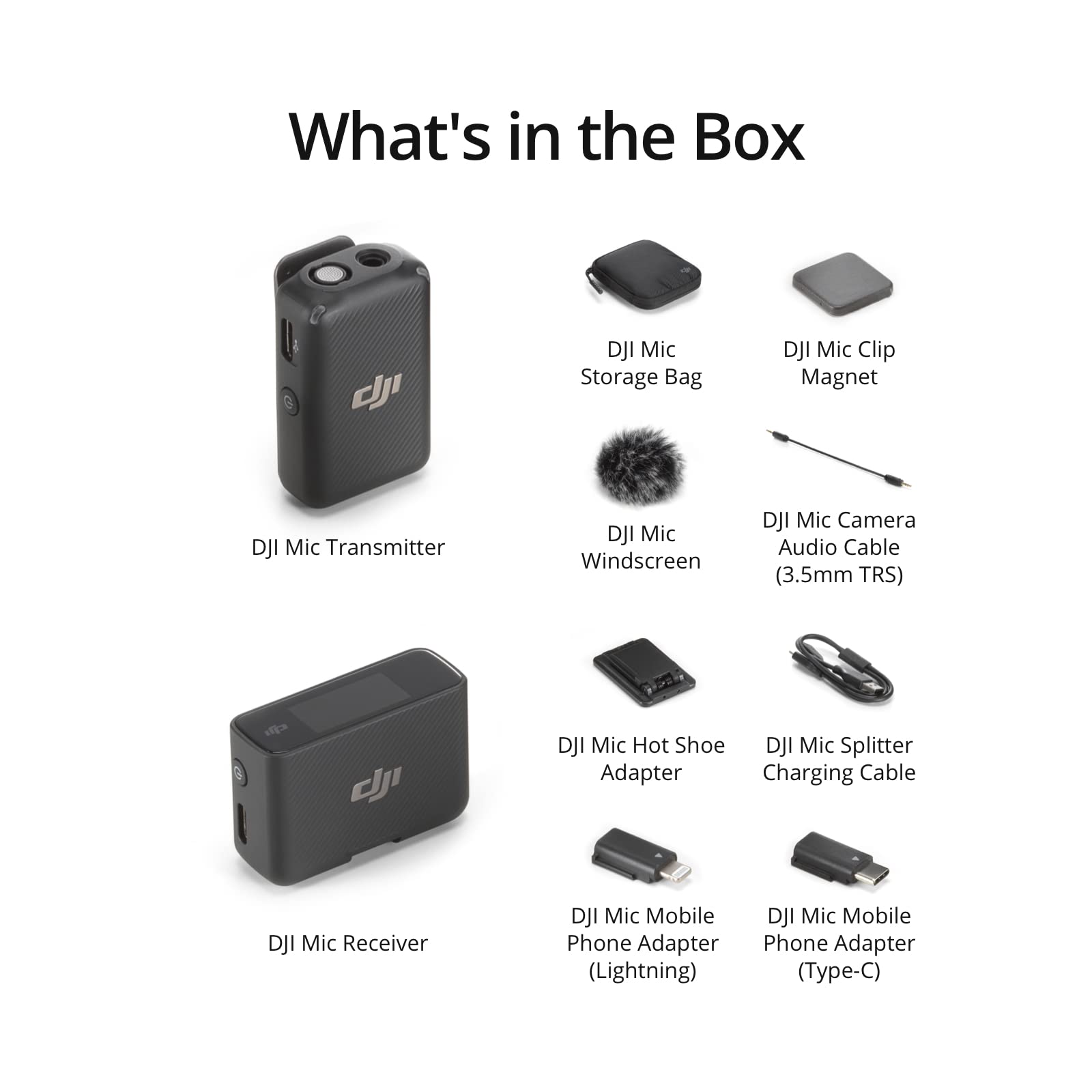 Overview DJI's wireless lavalier microphone system delivers exceptional sound quality and dual-channel recording at long-range distances. The mic system consists of one microphone transmitter and one receiver. Features seamless compatibility with smartphones, cameras, DJI Osmo Action 3, and DJI Osmo Mobile 6, letting you record crystal-clear audio for vlogs, livestreaming, outdoor scenes, and more. Notes 1. Measured with FCC compliance in an unobstructed environment without interference (160 m under CE). 2. Tested with a 48,000Hz sampling rate and 24-bit mono WAV audio format. FAQ What is the difference between DJI Mic (1 TX + 1 RX) and DJI Mic (2 TX + 1 RX + Charging Case)? Which one is right for me? Compared with DJI Mic (2 TX + 1 RX + Charging Case), DJI Mic (1 TX + 1 RX) includes only one DJI Mic transmitter and does not include the charging case. The storage bag and charging cable are also slightly different. The rest of the accessories are the same. DJI Mic (1 TX + 1 RX) is suitable for solo operators to take vlogs or do livestreaming. An operating time of 5 hours is enough for needs like store visiting, vlogging and teaching online class. The price is also more affordable. In the meantime, DJI Mic (2 TX + 1 RX + Charging Case) is more suitable for scenarios with two speakers, such as livestreaming, interview or video shooting. The two transmitters can record at the same time, and with the charging case, the operating time extends to 15 hours, meeting complicated creative needs like long videos and micro films that might take longer time.