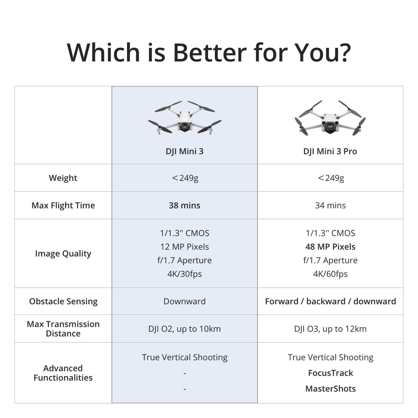 * DJI Mini 3 must be activated in the DJI Fly App. Due to platform compatibility issue, the DJI Fly app has been removed from Google Play. To ensure a better product usage experience, please go to the DJI official website to download the DJI Fly App. ** Please check and strictly abide by local laws and regulations before flying. 1. Standard aircraft weight (including the Intelligent Flight Battery, propellers, and a microSD card). The actual product weight may vary due to differences in batch materials and external factors. Registration is not required in some countries and regions. Please check local laws and regulations before use. 2. Measured at a constant speed of 21.6 kph in windless conditions. With the Intelligent Flight Battery, the aircraft can fly for up to 38 minutes. With the Intelligent Flight Battery Plus (sold separately and only in select countries), the flight time is extended to up to 51 minutes, but the aircraft will weigh more than 249 g. Please check and strictly abide by local laws and regulations before flying. Under the preceding conditions, a maximum range of 114 minutes can be achieved by replacing the battery twice. 3. HDR video does not support video recording at over 30 fps. 4. DJI Mini 3 features the dual native ISO values of ISO 100 and ISO 800. 5. FCC compliant and tested in an outdoor open environment without interference. FCC: 10 km, CE: 6 km, SRRC: 6 km, MIC: 6 km. Measured in an unobstructed outdoor environment free of interference. The above data shows the farthest communication range for one-way, non-return flights under each standard. During your flight, please pay attention to RTH reminders in the DJI Fly app.