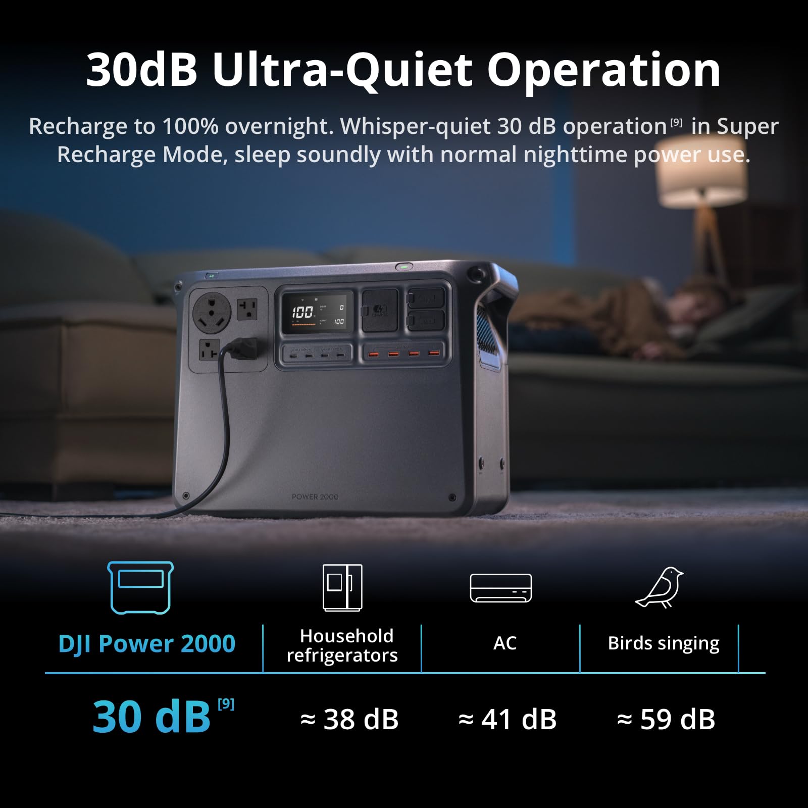 -Quiet Comfort for Restful Nights - DJI Power 2000 runs as low as 30 dB, reducing noise during nighttime use in RVs—sleep undisturbed when the battery generator charging devices in enclosed spaces.