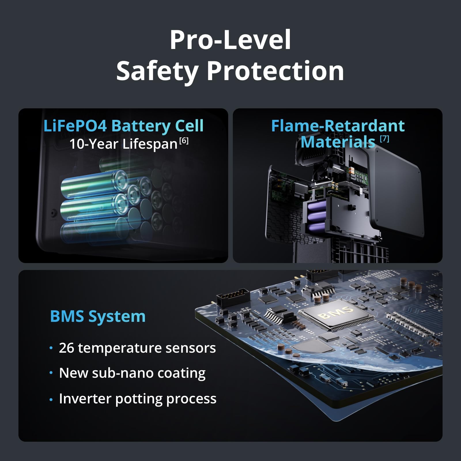 -Uncompromising Safety, Anywhere - DJI Outdoor Generator features a 2048Wh LFP battery, smart BMS, sub-nano coating, and flame-retardant housing—ensuring safety even in wet or rugged outdoor conditions [18].