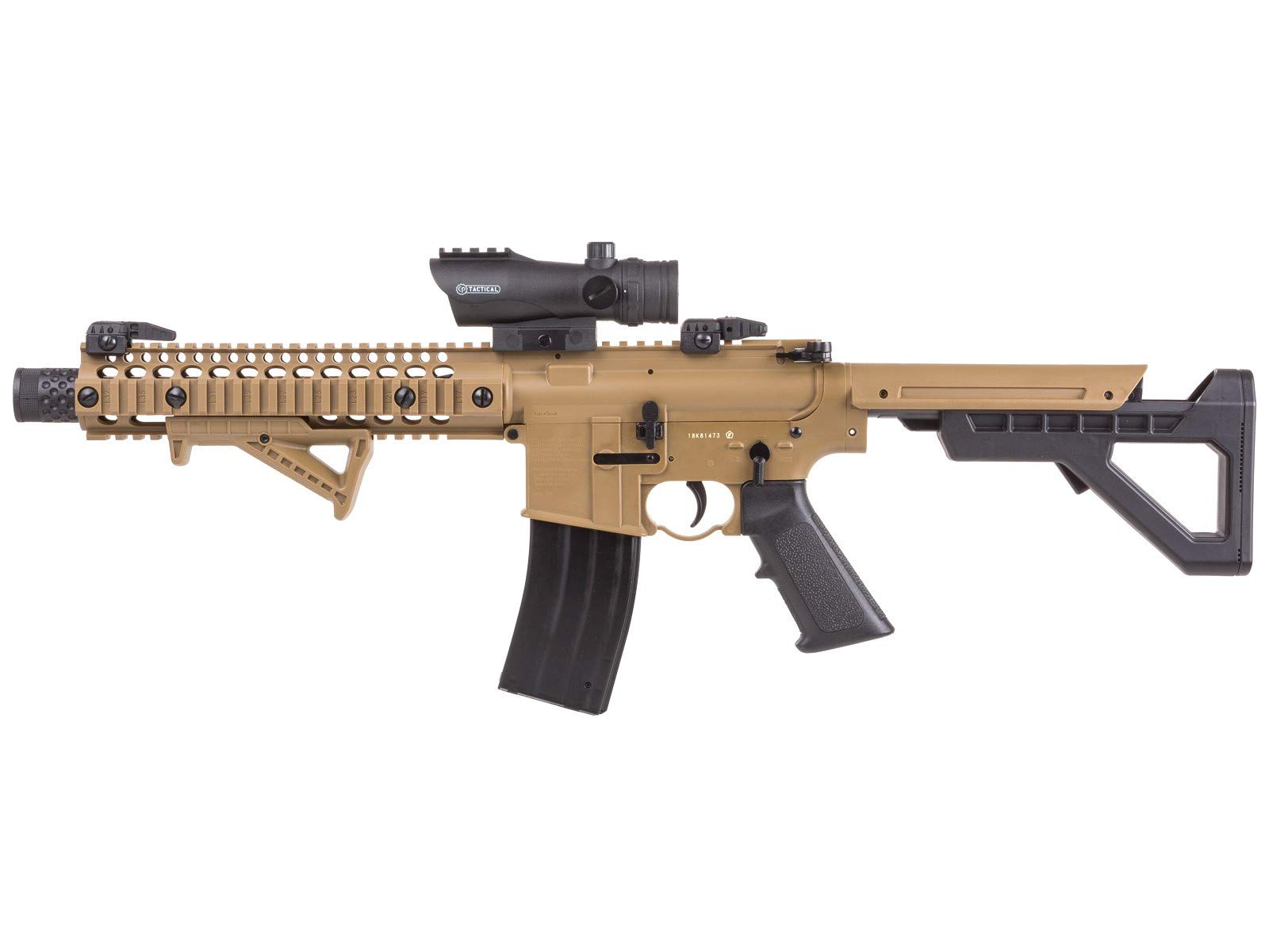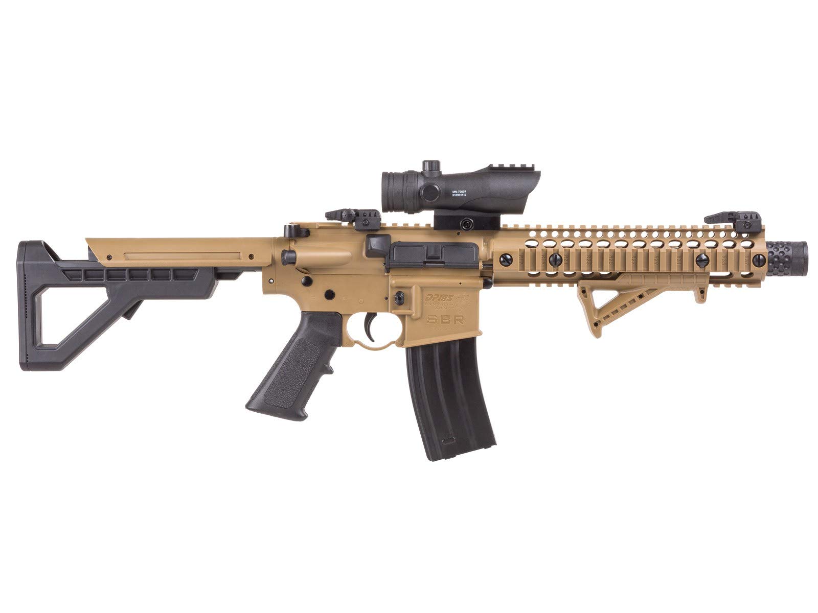 Crosman DPMS SBR Full-Auto BB Air Rifle Kit with Red Dot Sight, FDE Tactical Short Barrel Rifle Adjustable 6 Position Butt Stock AR Compatible Pistol Grip Quad Rail forearm for accessory mounting Unique muzzle end cap Flip up back up iron sights (BUIS) Angled Foregrip Realistic Weight and Functions Blowback bolt-action 25rd magazine Uses 2 12-gram CO2 cartridges Length: 26.9†to 30.4†Kit includes Crosman DPMS SBR Full-Auto BB Air Rifle, Speedloader and CenterPoint 1x30mm Large Battle Enclosed Reflex Sight with 3 MOA Red Dot and Picatinny Mounts ... Crosman DPMS SBR Full-Auto BB Air Rifle Kit, FDE ...
