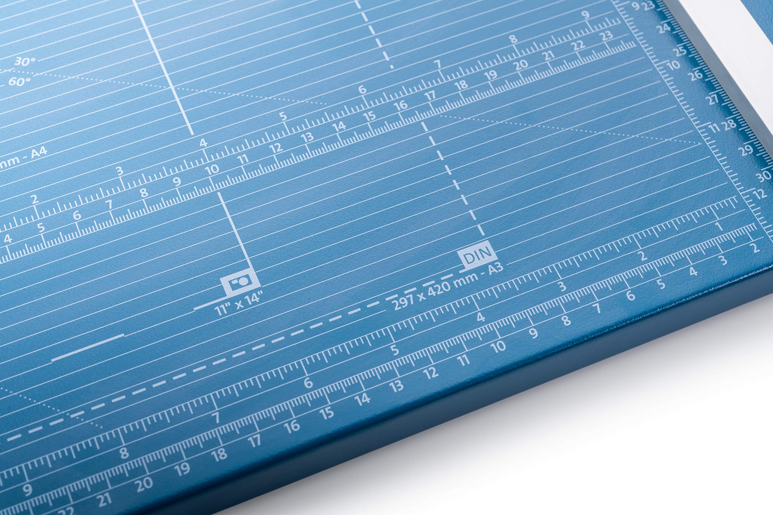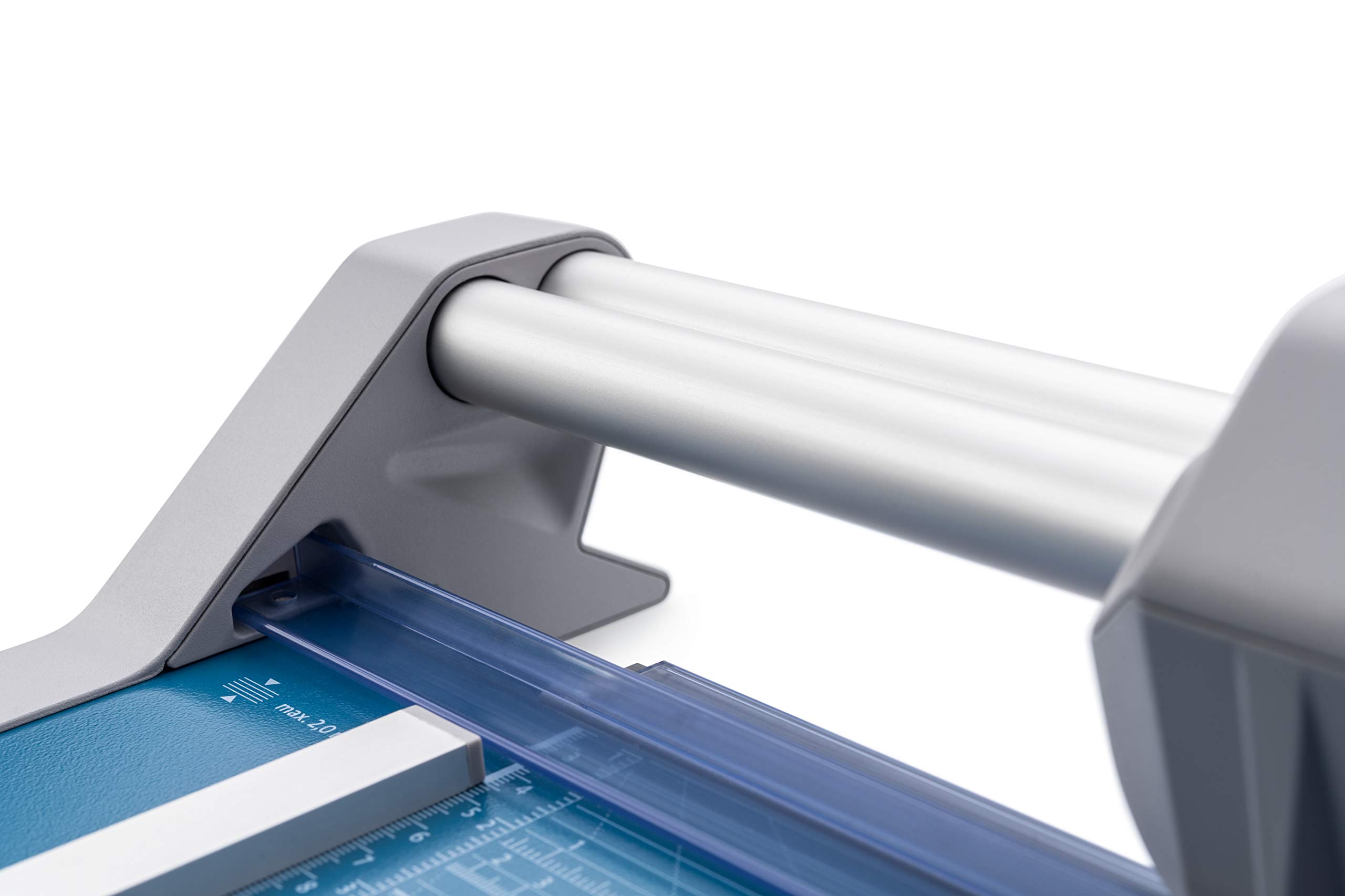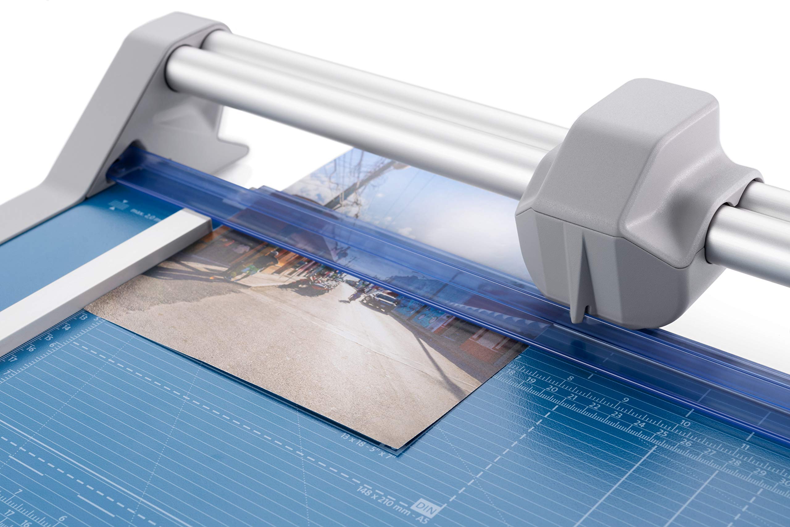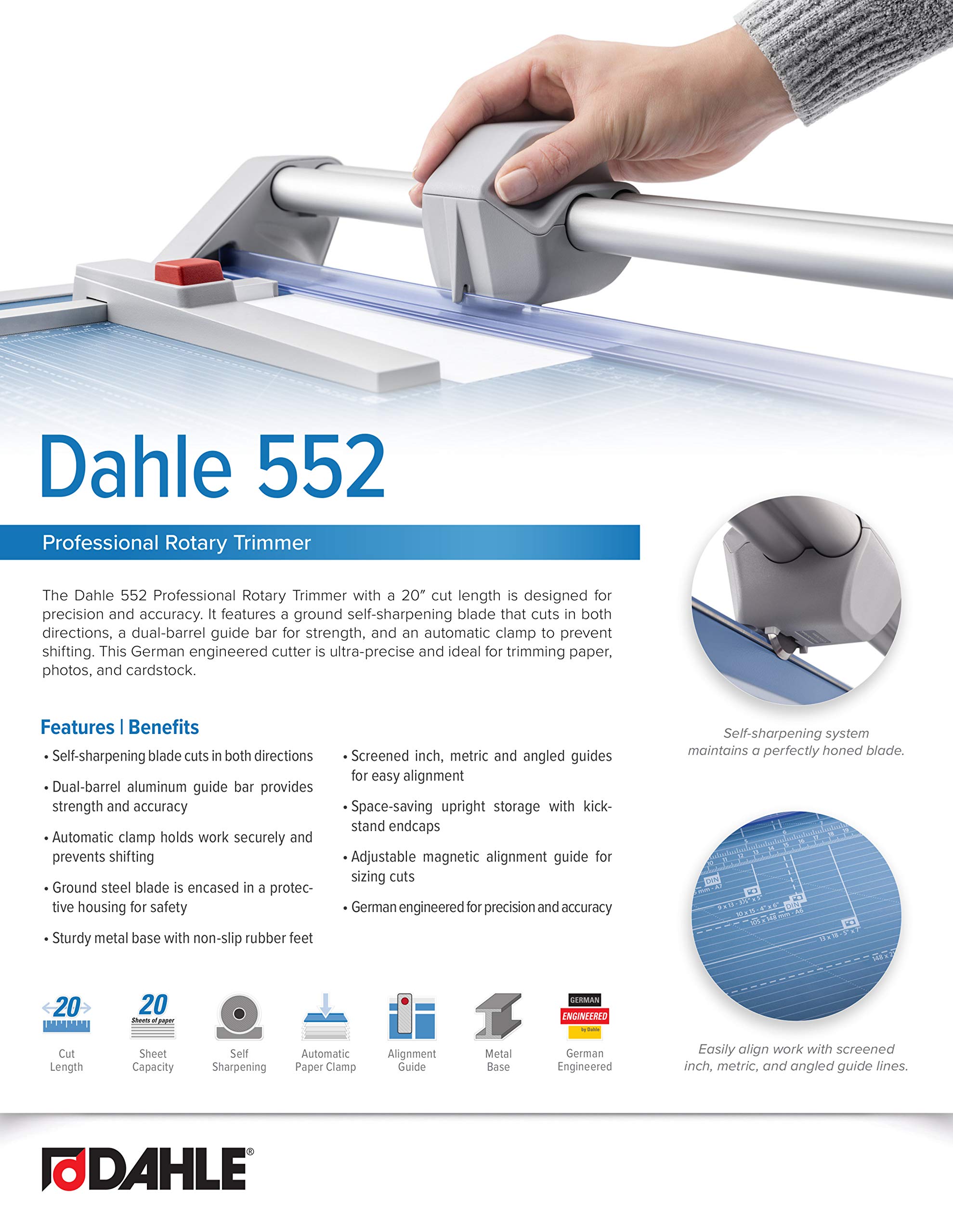 The Dahle 552 Professional Rotary Trimmer with a 20" cut length is designed for precision and accuracy. It features a ground self-sharpening blade that cuts in both directions, a dual-barrel guide bar for strength, and an automatic clamp to prevent shifting. This German engineered cutter is ultra-precise and ideal for trimming paper, photos, and cardstock.