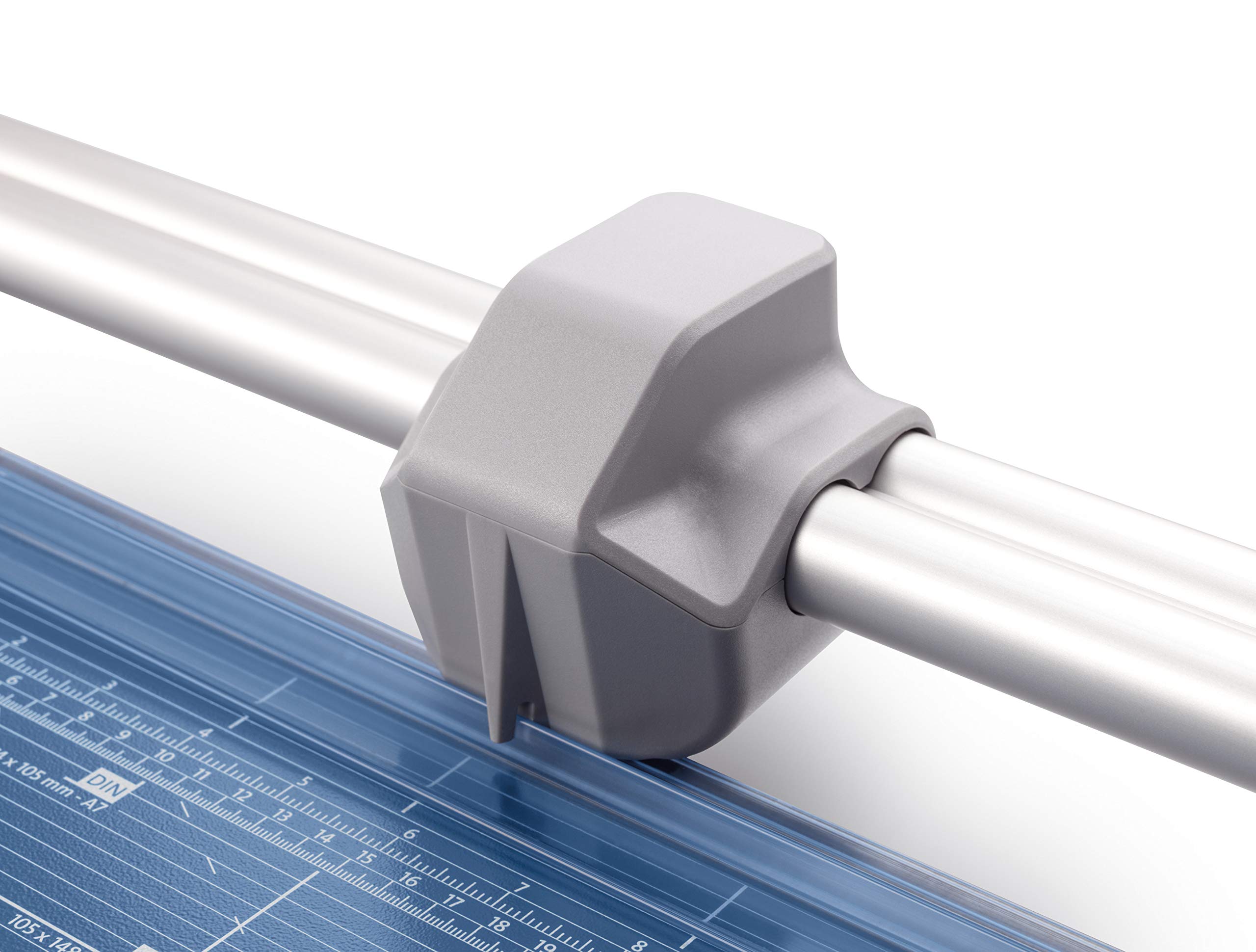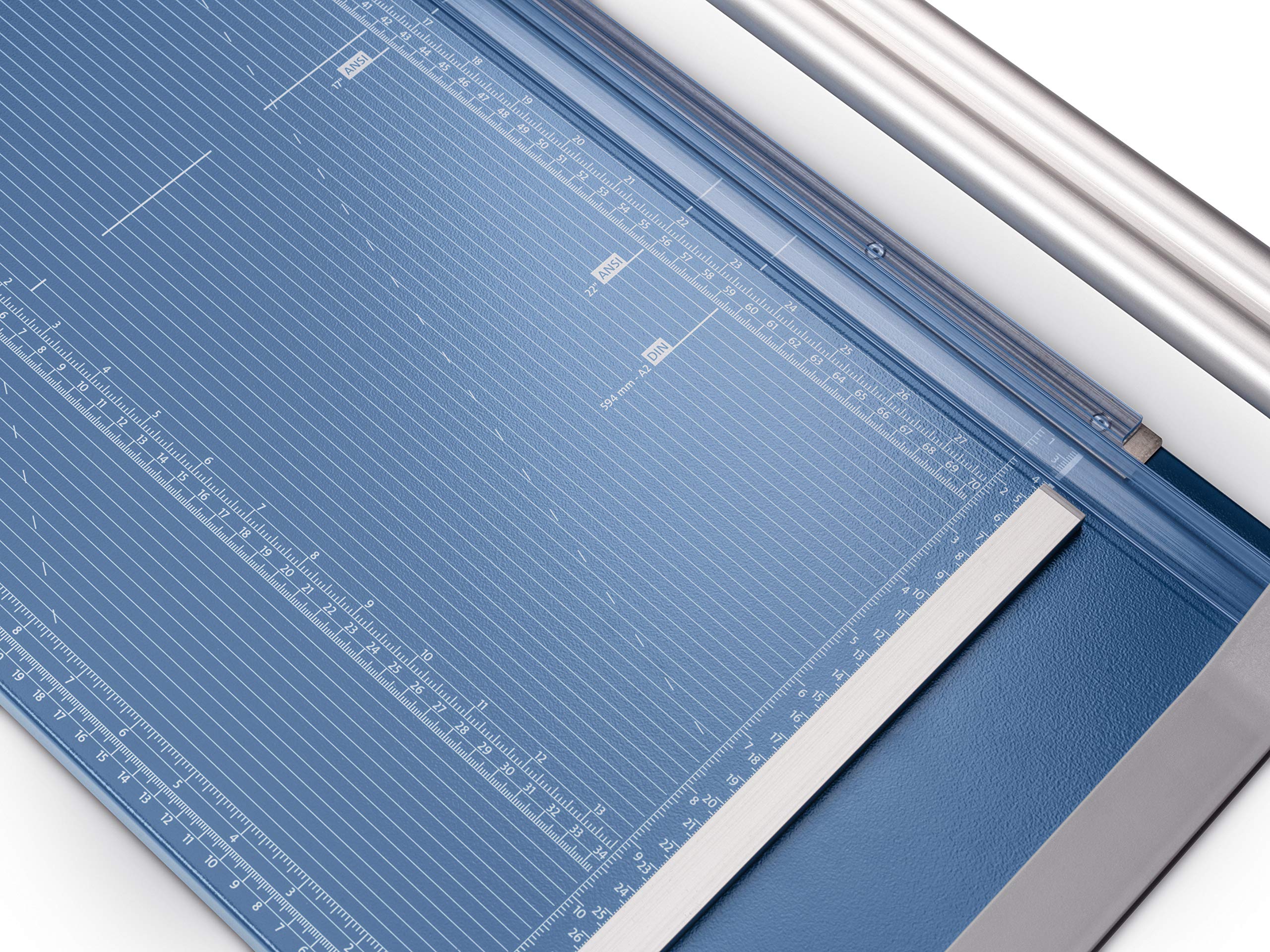 The Dahle 550 Professional Rotary Trimmer with a 14" cut length is designed for precision and accuracy. It features a ground self-sharpening blade that cuts in both directions, a dual-barrel guide bar for strength, and an automatic clamp to prevent shifting. This German engineered cutter is ultra-precise and ideal for trimming paper, photos, and cardstock.