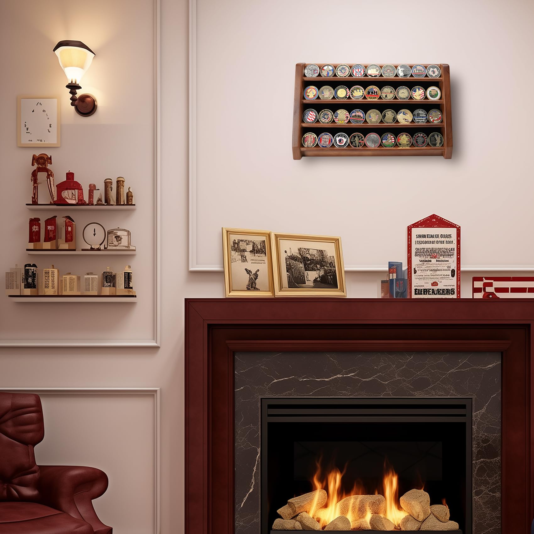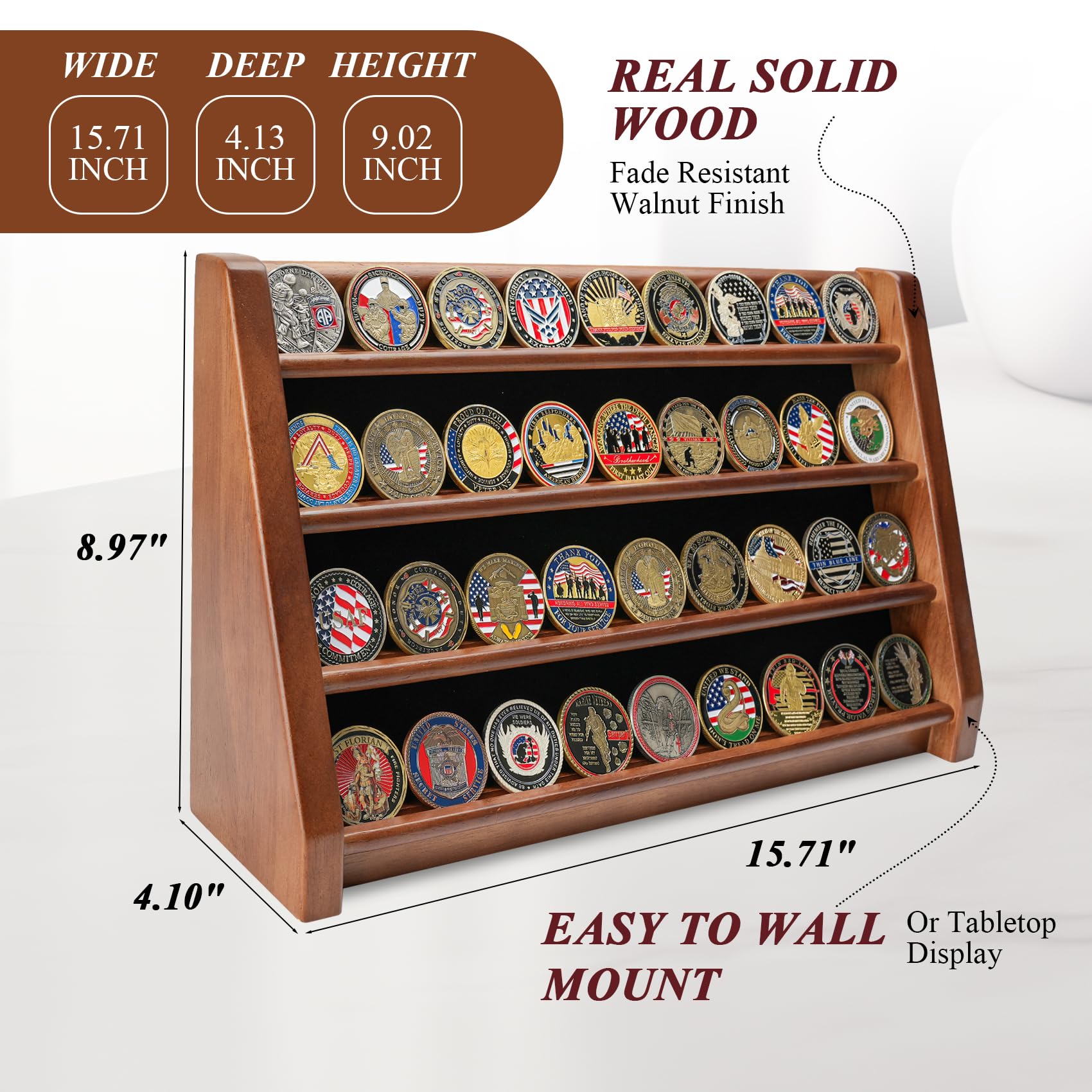 DecoWoodo Challenge - Vitrina para monedas, 4 filas de madera maciza, soporte militar para monedas, capacidad para 30 monedas para escritorio o montaje en pared, soportes para monedas para coleccionistas (4 filas acabado en nogal)