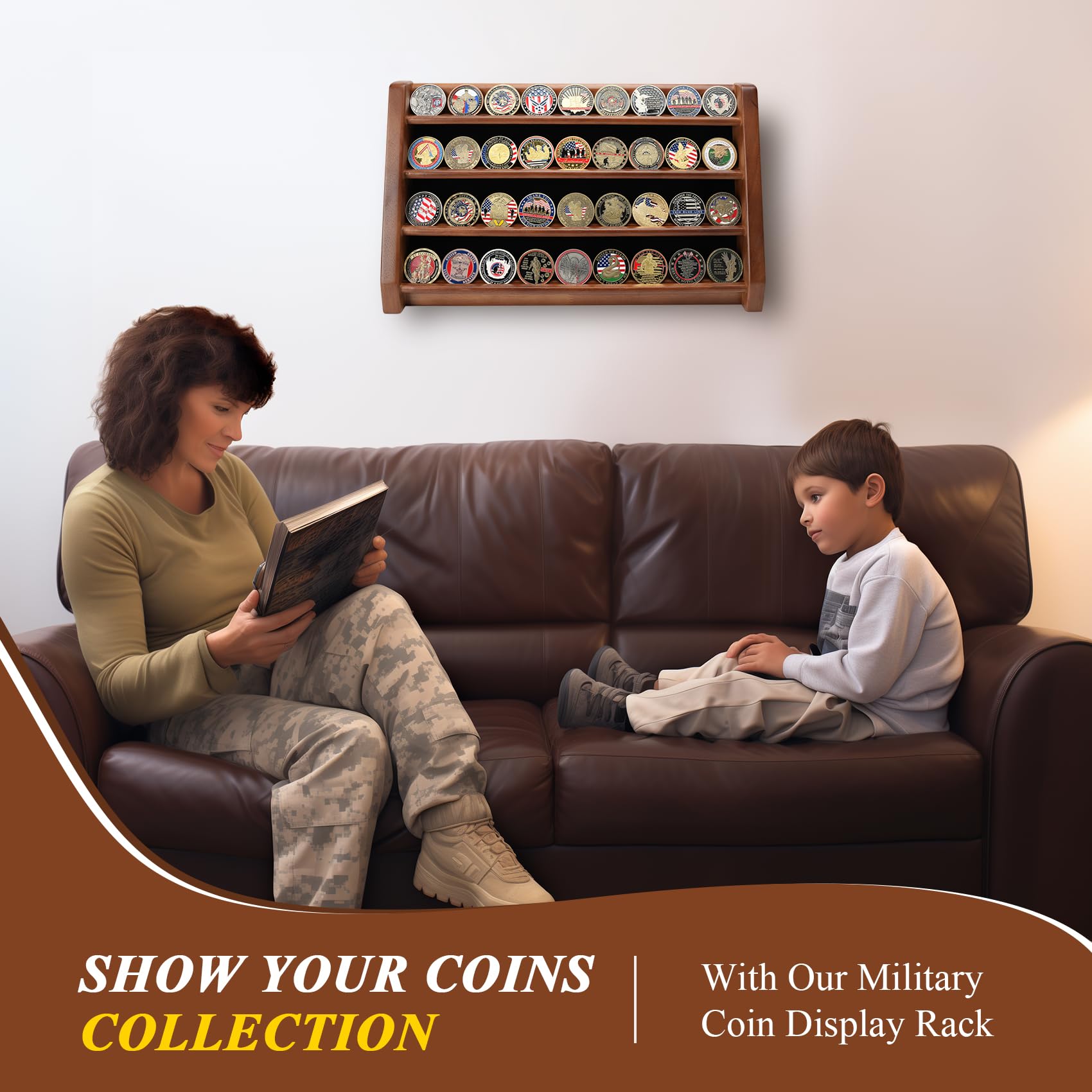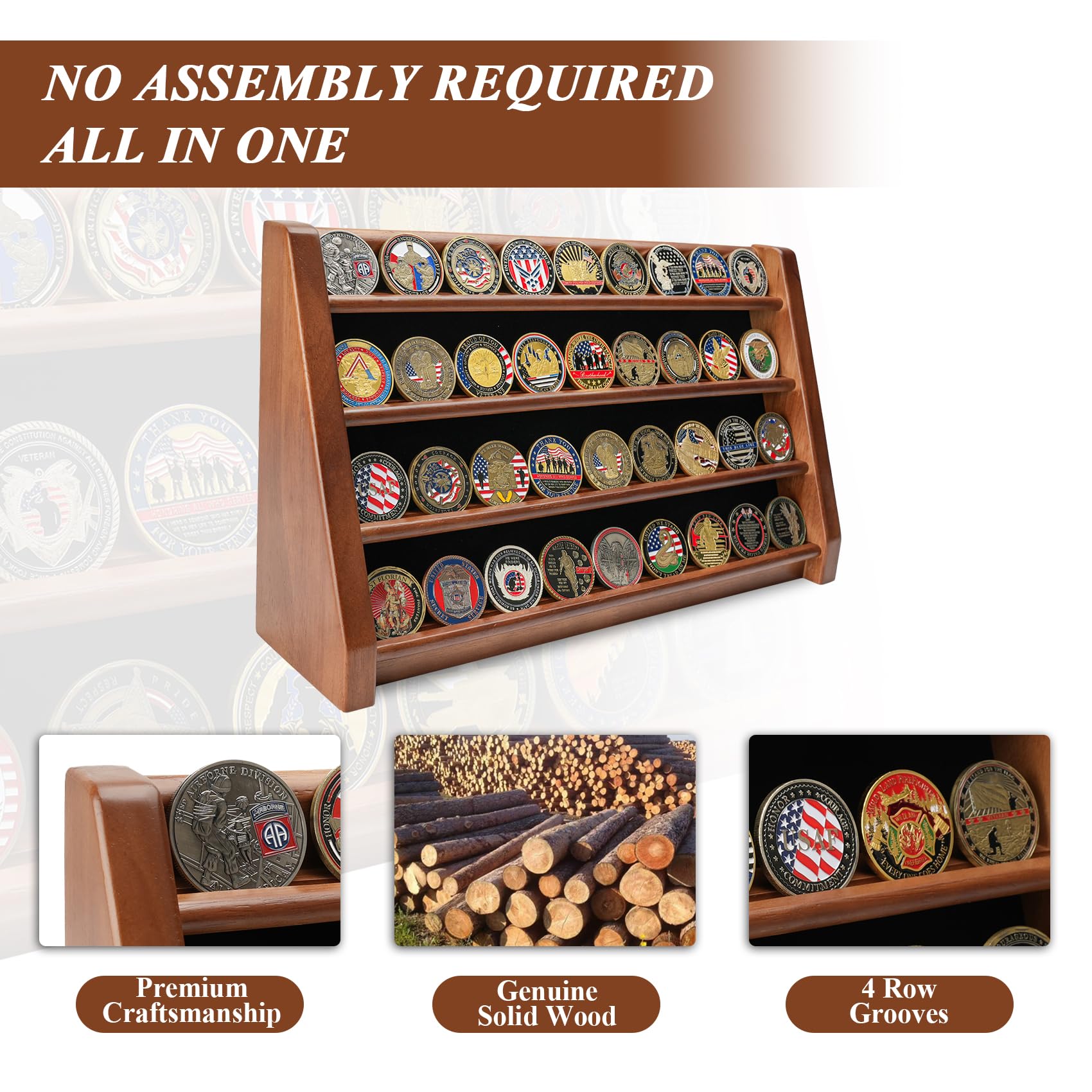 DecoWoodo Challenge - Vitrina para monedas, 4 filas de madera maciza, soporte militar para monedas,