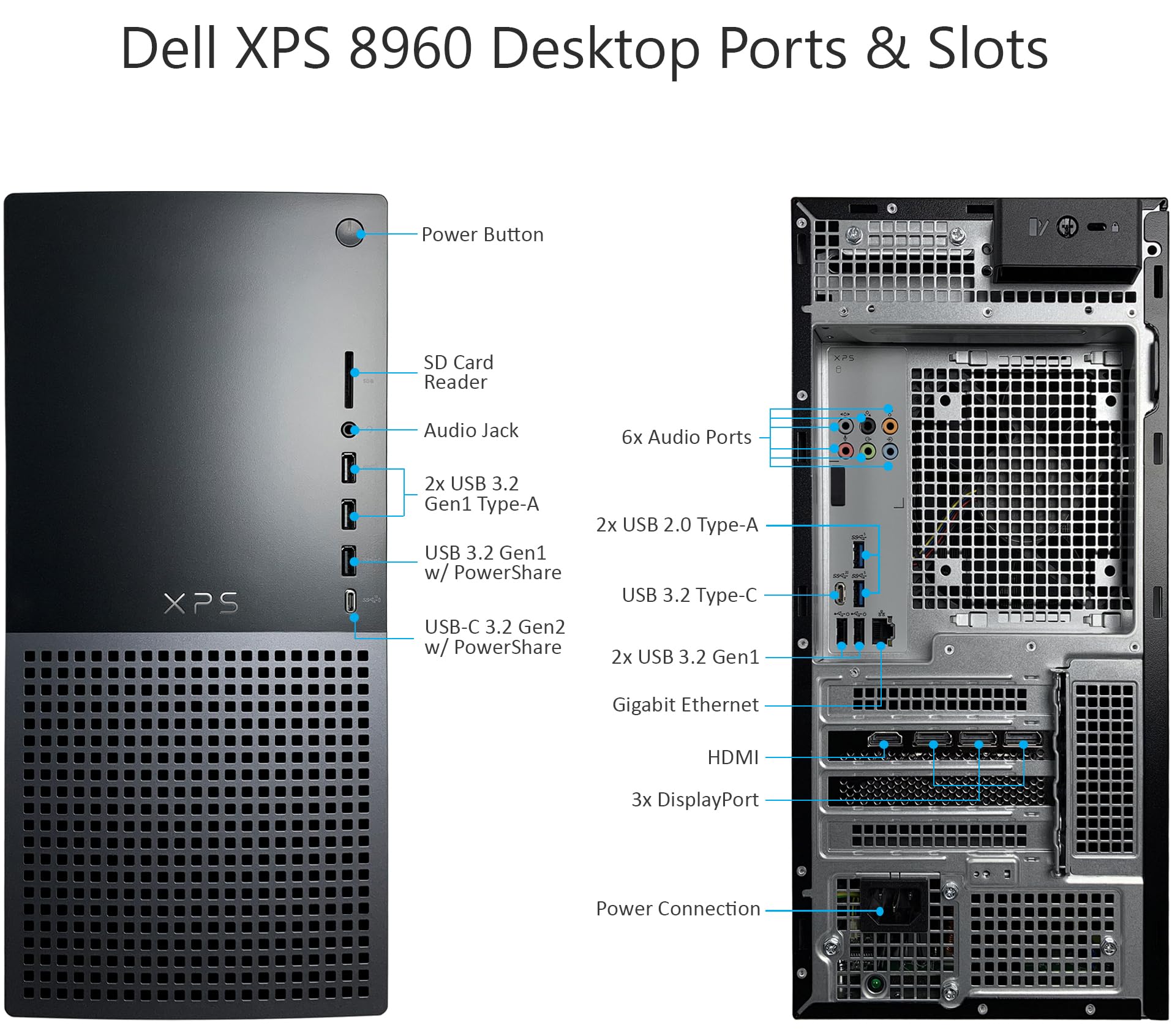 Dell XPS 8960 Tower Desktop Computer Bigger and better: Now sporting a larger chassis than before—27L vs 19L—the new XPS Desktop packs more power than ever. The bigger chassis gives creativity room to grow, with peak performance today, infinite expandability tomorrow. Peak performance: Take a revolutionary leap into real-world hybrid performance with an innovative design that distributes processing power to where you need it most. Streaming, browsing, video editing and more with 14th Gen Intel Core i9-14900K processor that gives the boost you need for your biggest breakthroughs. NVIDIA GeForce RTX 4070 12GB GDDR6X Graphics Card: The XPS Desktop has the Dedicated NVIDIA GeForce RTX 4070 12GB GDDR6X Graphics Card Next-level memory: DDR5 memory boasts up to 50% faster clock speed than DDR4 memory, while supporting capacities up to 64GB and speeds up to 4800 MHz. This means you can expect better overall performance, especially when managing large creative content or gaming with friends. Smoother experiences: Killer Networking and Wi-Fi 6E combine to bring you Intel Killer Wi-Fi 6E AX1675, which can detect, classify and prioritise system traffic, delivering up to 75% less latency than competing 2x2 Wi-Fi products—for a smooth, premium online experience. Purposeful design: Down to even the smallest details, the XPS Desktop was designed for thermal efficiency and runs cooler than the previous generation desktop. Improved airflow: Engineered with an open layout, the new XPS Desktop is built without anything sitting on top of the CPU/GPU, to avoid limiting airflow. This enables the desktop to remain cooler, compared to its predecessor.
