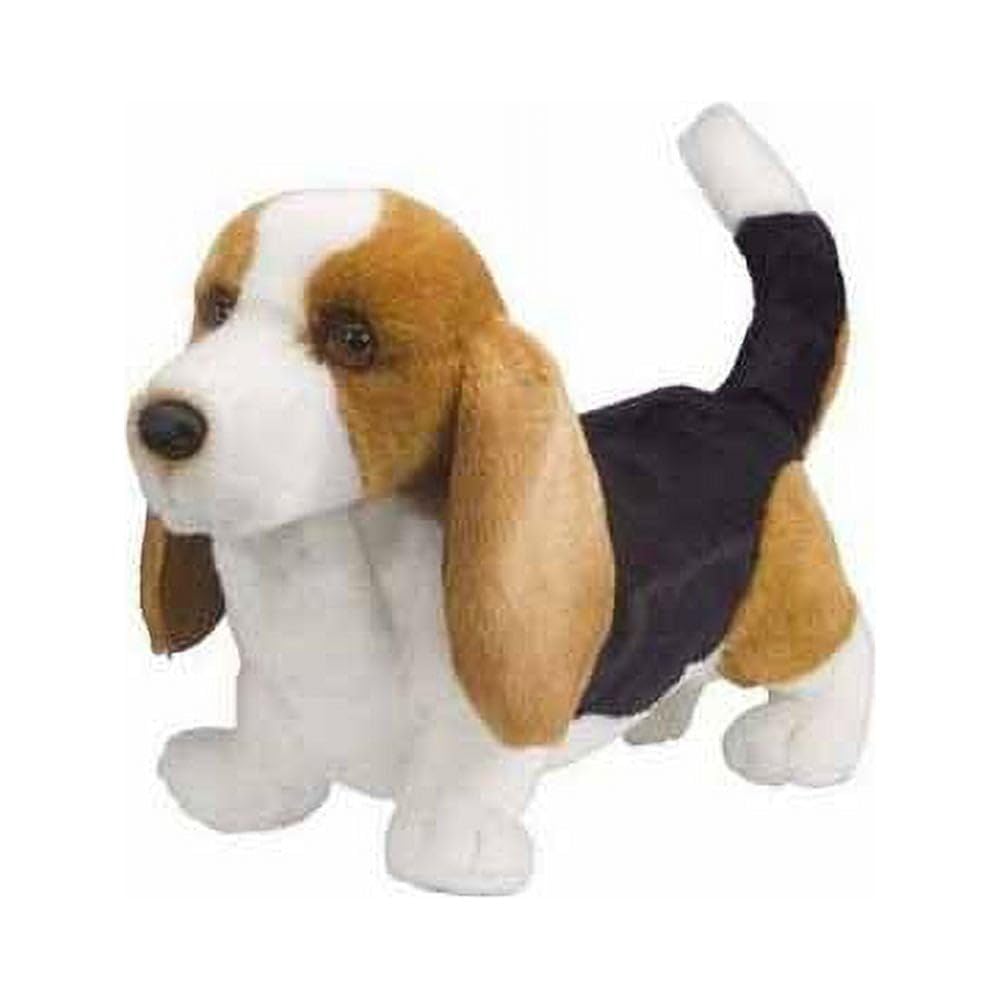 Harold, our delightful Basset Hound stuffed animal, realistically captures everything about this stately breed that a dog lover could hope for! Harold features sad droopy eyes, wrinkly neck folds, pendulous ears, and a long curved tail. His tri-colored coat is made with ultra soft fabric that begs to be petted and cuddled. A realistic leatherette nose and airbrushed details on his face and around the edges of his ears bring additional realism to Harold's design. Invite this gorgeous plush hound to live with you today or send him home to a Basset Hound lover. Wherever he goes, he's sure to win fans with his sweet, expressive face!