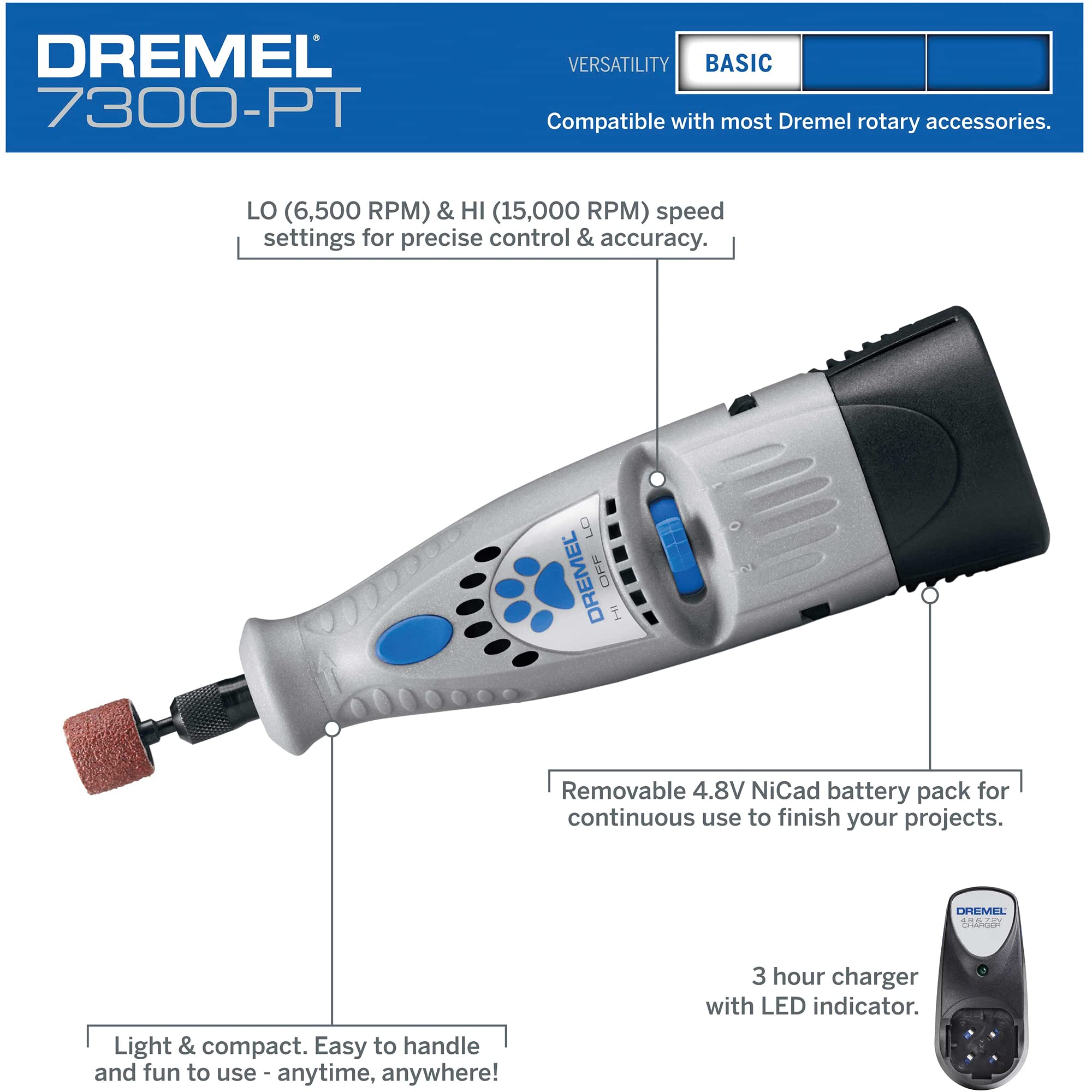 Dremel 7300-Pt 4.8V Inalta de mascotas inalámbricas Herramientas para clavos y molienda, fácil de usar, recargable, de forma segura, recortes de mascotas y perros