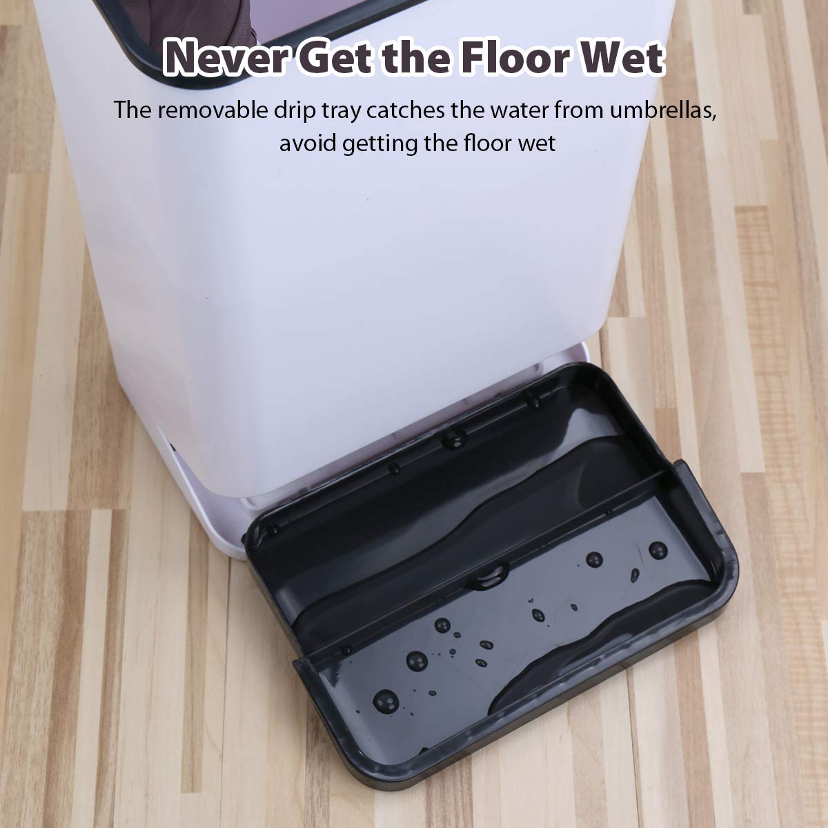-☂ Collecting Water Well. The umbrella stand rack has a removable drip tray to hold water from umbrellas well, to avoid getting your floor or carpets wet. When the drip tray is full of water, you can easily take it out to pour out the water and clean. Our umbrella rack will provide you with a clean and tidy environment.